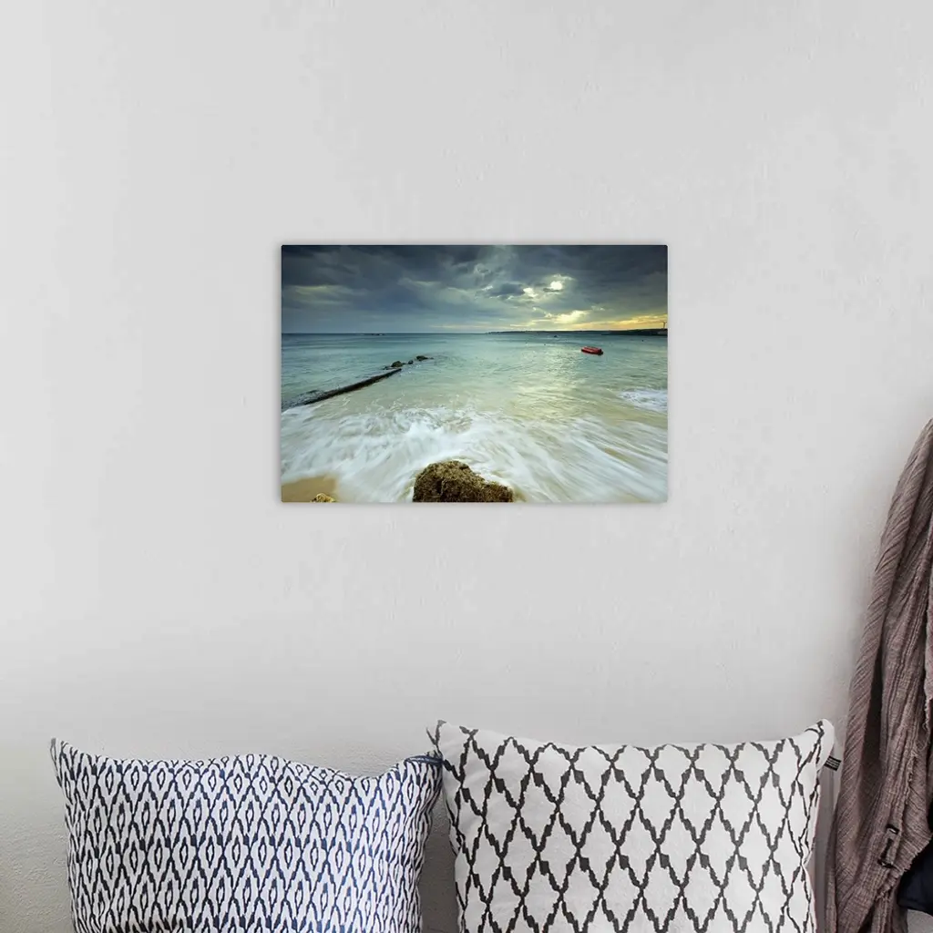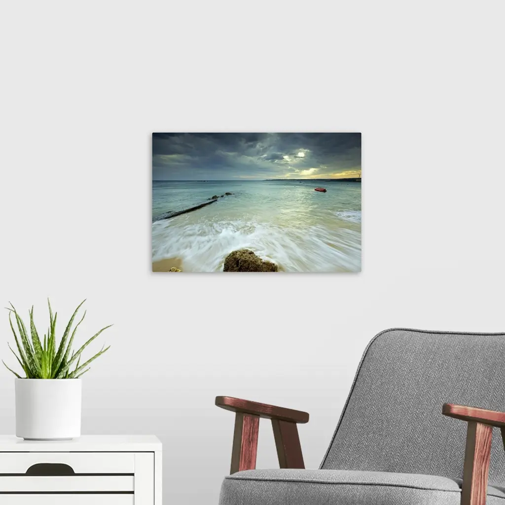 Nanwan, Kenting on cloudy evening with golden sun shining behind leaden clouds above nuclear power plant on distant hill and green sea water rushing onto beach and crashing on coral reef taken in Pingtung, Taiwan.