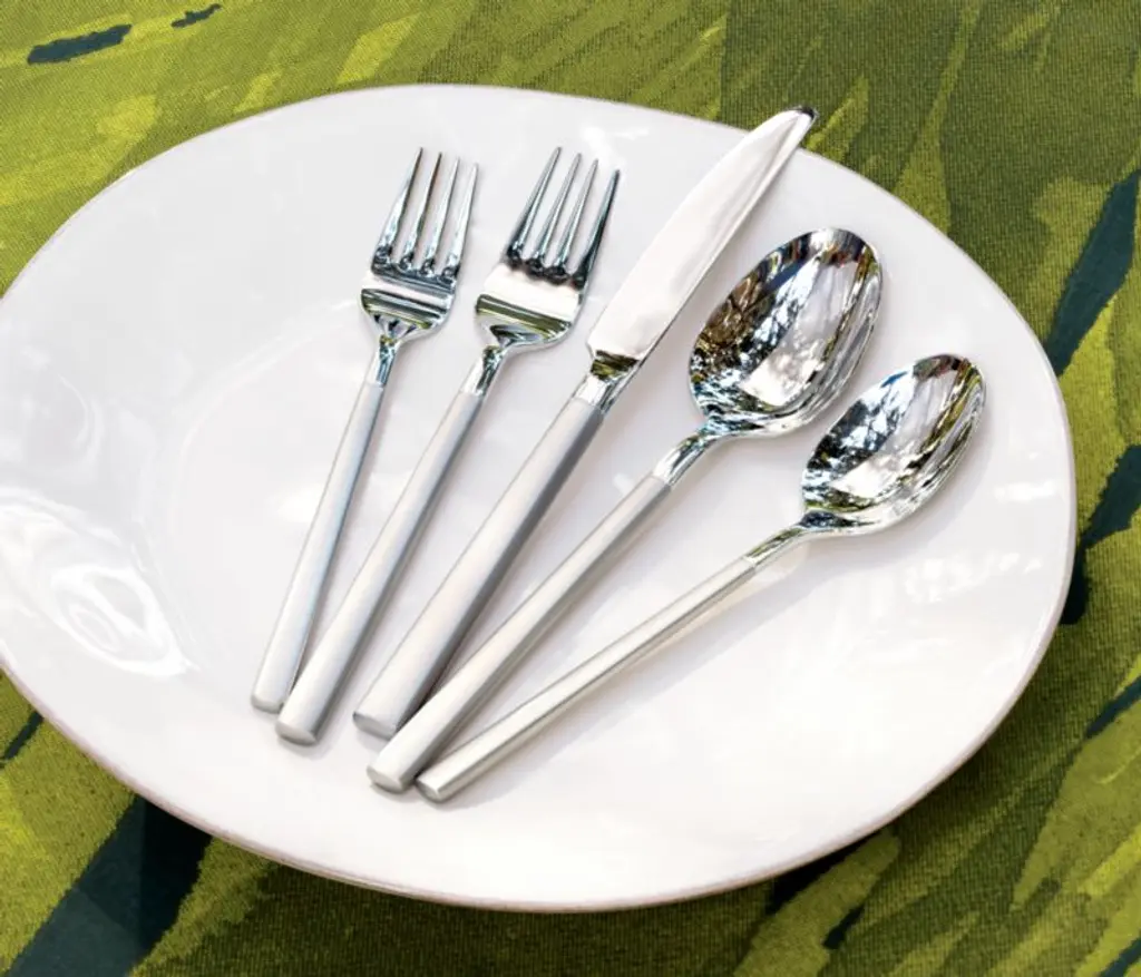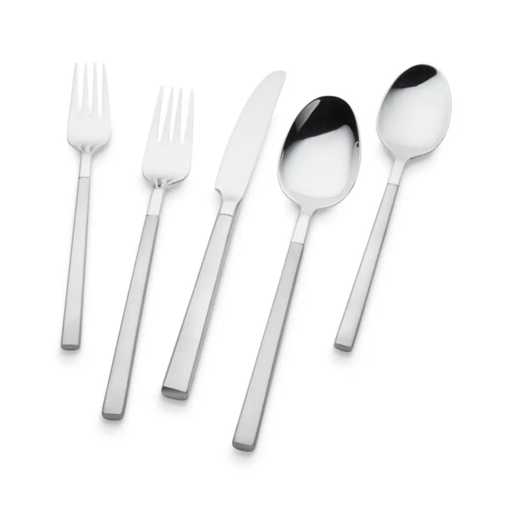 Streamlined modern stainless steel flatware features an eye-catching dual finish that contrasts frosted matte handles with mirror-polished heads and blades. Each of the four 5-piece place setting includes a salad fork, dinner fork, knife, spoon and teaspoon. For a unified table, pair with our Kenton serving set or any of our stainless steel serving utensils.Learn how to set a table with our simple guide.