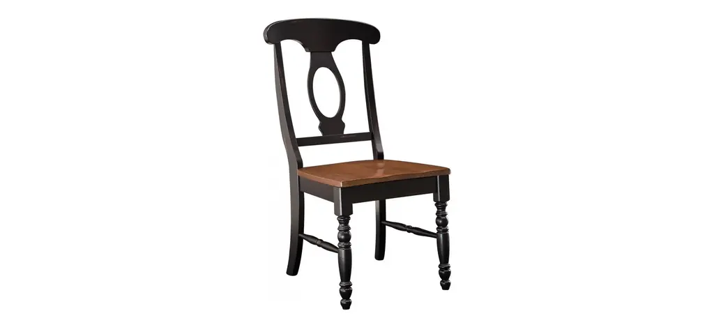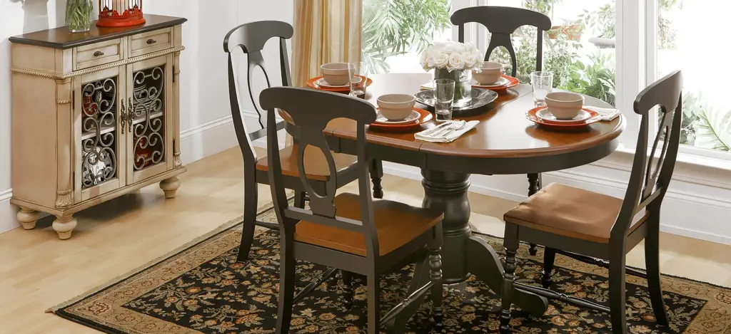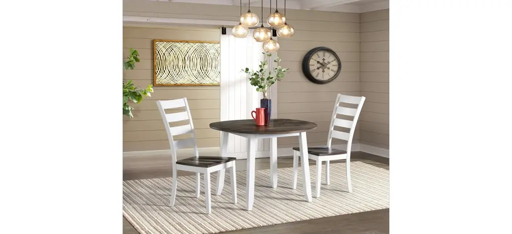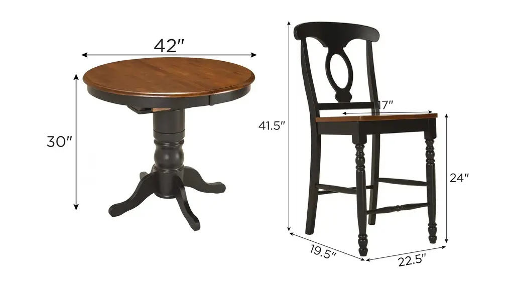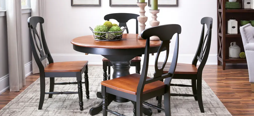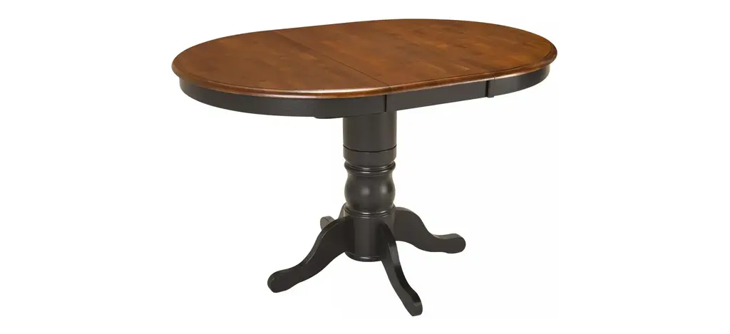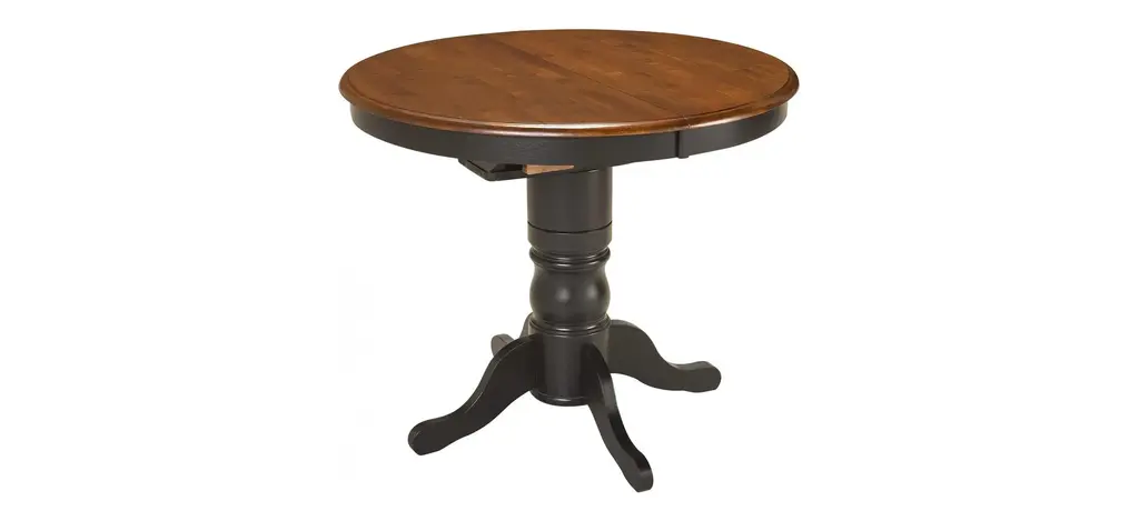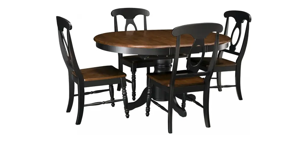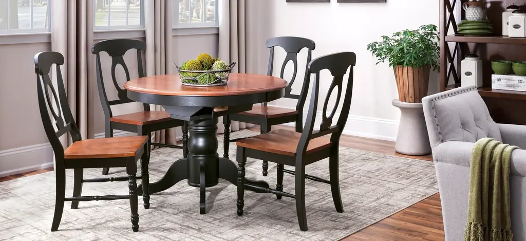 The best part about this Kenton 5-pc. dining set may be its ability to mix and match styles so well! Its dark walnut and ebony finishes serve up a casual two-toned look, plus its smaller scaling makes it a smart choice for an eat-in kitchen or breakfast nook. But this dining set also features more formal design elements, like a gorgeous pedestal table base and keyhole chair backs. And if you're space conscious, you'll appreciate the table's self-storing butterfly leaf—it provides extra table space when you need it and can easily be stowed out of sight when you don't!