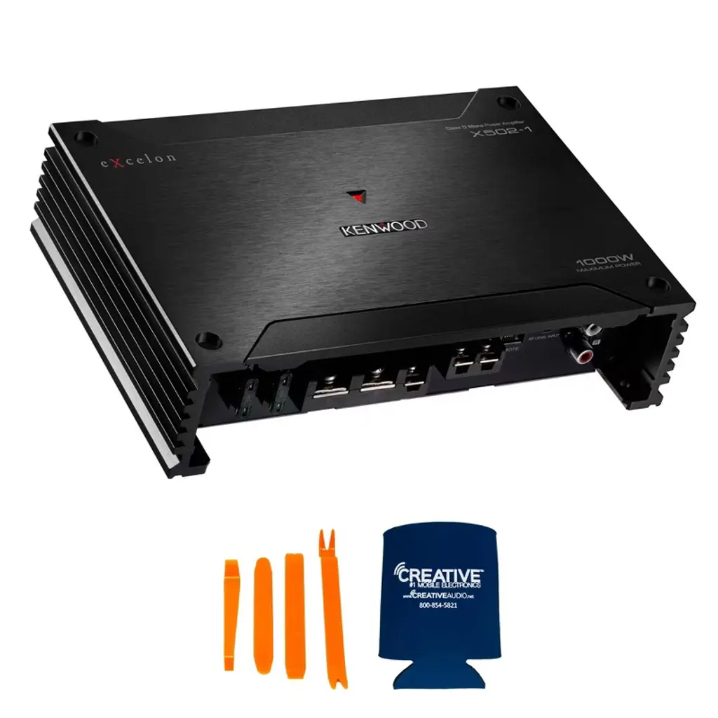 Kenwood P-XW1241S Single 12" Subwoofer in a Vented Enclosure and includes a X502-1 1000W Max Power eXcelon Class D Mono Amplifier- This bundle includes Kenwood P-XW1241S Single 12" Vented Enclosure, 300W RMS Power, a Kenwood X502-1 eXcelon Class D Mono Power Amp, 500Wx1 @ 2 ohms, a pry kit, and a Creative Audio coozy. Kenwood P-XW1241S Single 12" Vented Enclosure, 300W RMS Power Features - • Ported enclosure with one 4-ohm 12" subwoofer • Polypropylene cone with diamond array pattern and rubber surround • Stress controlled spider • Closed yoke speaker design for airflow control • 5/8" MDF construction with 3/4" MDF baffle board • Can be installed as front-, rear-, or down-firing Box Contents - • Ported enclosure loaded with one 12" Excelon subwoofer (4 ohm) • 2 Mounting brackets • Eight 1" screws Kenwood X502-1 eXcelon Class D Mono Power Amp, 500Wx1 @ 2 ohms Features - • Max Power 1000W • Size (inch) (W) 8-3/8" x (H) 2-1/16" x (D) 5-7/8" • Variable Low Pass Filter • Bass Boost • Optional Wired Remote Ready • Max Power: 1000W • RMS POWER OUTPUT (4Ω): 300W • RMS POWER OUTPUT (2Ω): 500W • Speaker Level Input • Signal Sensing Turn-On • Infrasonic Filter Specifications - • Signal to Noise Ratio: 100dB (Reference: Rated Power into 4Ohms at 14.4V) • Frequency Response: 20Hz-200Hz (+0dB, -3dB) • Input Impedance: 10k ohm • Speaker Impedance: 4Ω (2Ω to 8Ω allowable) • RCA Input Sensitivity: 0.2[V] - 5.0 [V] • Speaker Level Input Sensitivity: 4.0[V] - 12.0 [V] Terminals - • Battery & Ground: M6 Screw Type Terminal Block • Speaker Output: M4 Screw Type Terminal Block