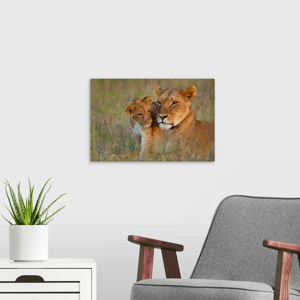 Kenya, Lioness with cub at dusk in Ol Pejeta Conservancy, Laikipia Country wall art for home and office decor. Discover canvas art prints, photos, mural, big canvas art and framed wall art in GreatBigCanvas.com's varied collections.