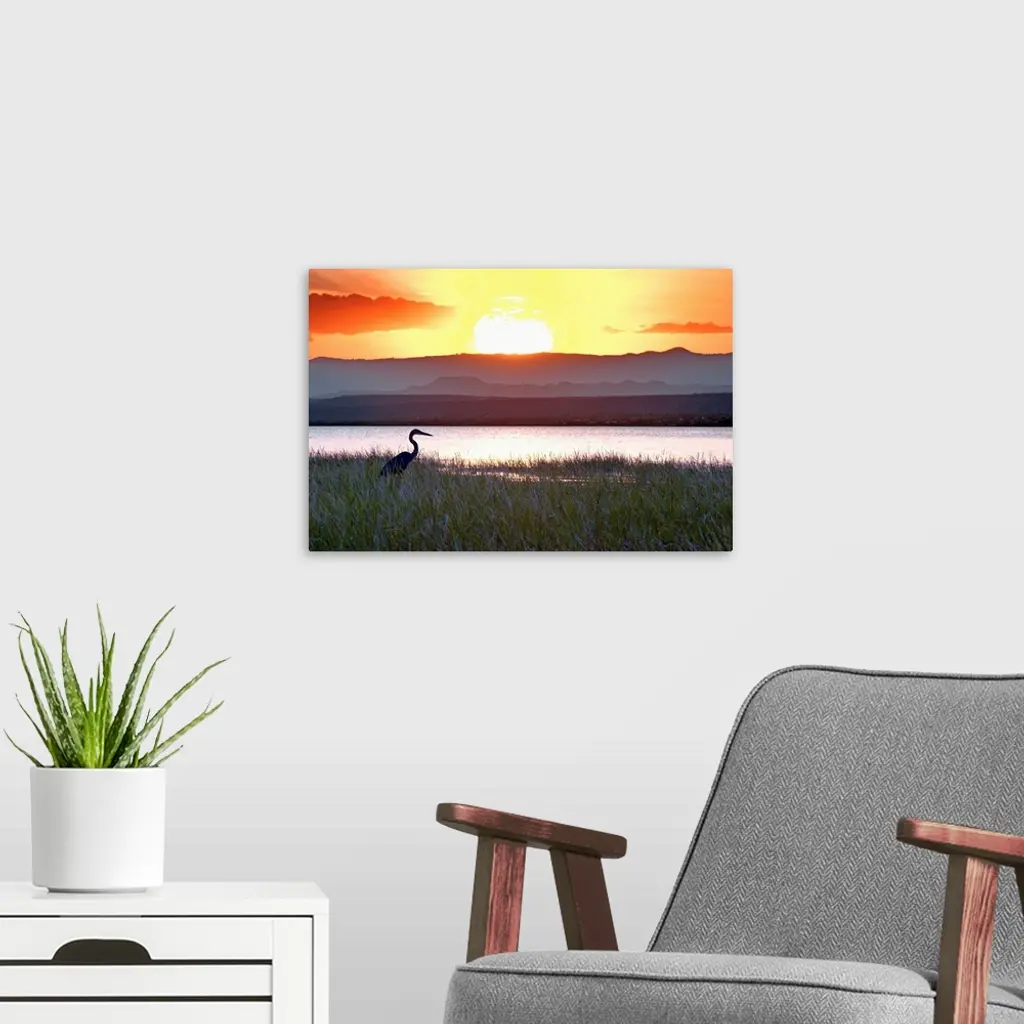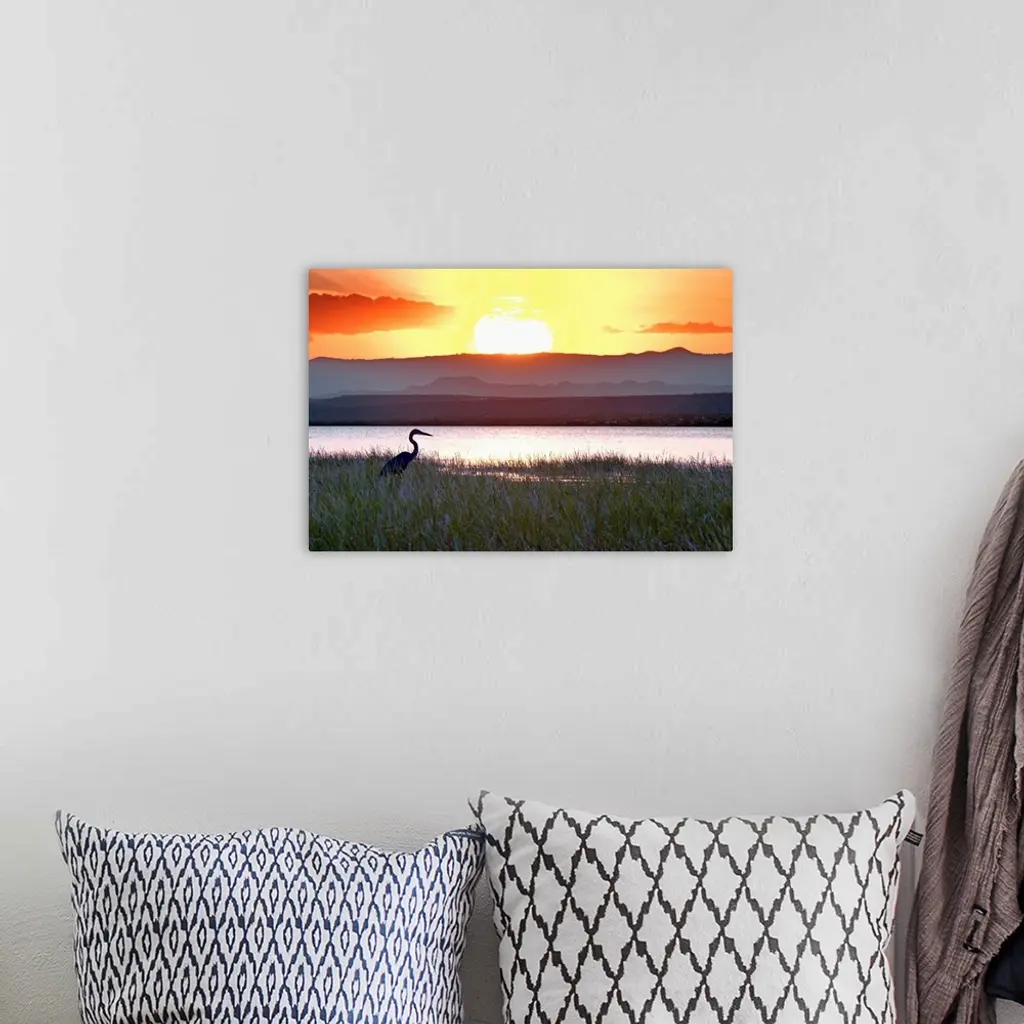 Kenya, Rift Valley, Loruk, A heron at sunset on the island of Ol Kokwe in Lake Baringo