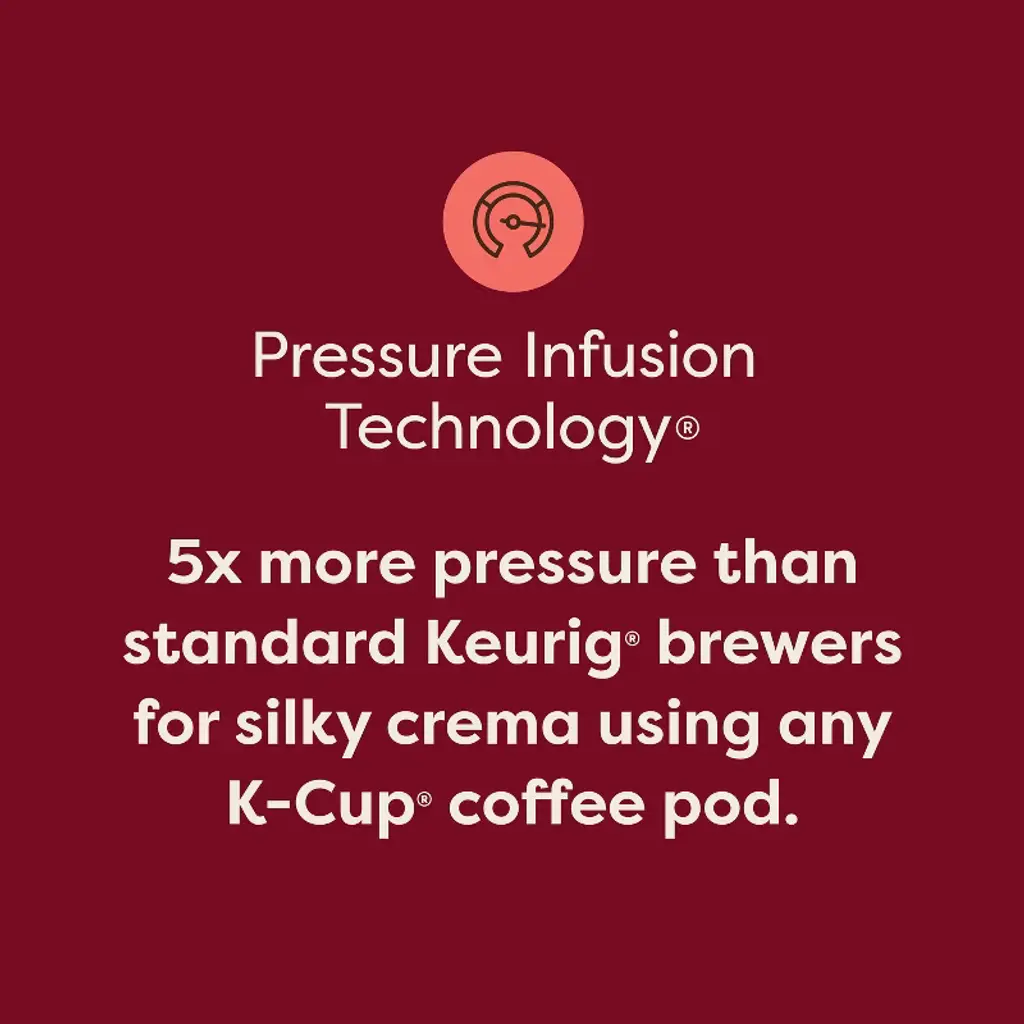 The Keurig K-Crema Single Serve Coffee Maker — your favorite Keurig coffees, elevated to crema-topped coffee perfection. What’s Crema? It’s a layer of micro coffee bubbles formed through our innovative PressureInfusion Technology that add rich flavor and a silky-smooth texture to any coffee K-Cup Pod that is truly crema-licious. Keurig K-Crema also offers incredible versatility with its PressureInfusion Technology and MultiStream Technology. This allows you to effortlessly brew not just crema-topped coffees, but also full-bodied espresso-style shots, classic coffee, cocoa, and tea—all at the touch of a button. With hundreds of varieties of K-Cup Pods available, you'll find endless options to satisfy your cravings. To use the PressureInfusion Technology setting, simply press the ‘Pressure’ button to infuse 5x more pressure than standard Keurig brewers, resulting in a rich coffee crowned with a layer of silky crema. In the mood for a more traditional cup? Simply press the ‘Classic’ button and our MultiStream Technology will extract the full flavor and aroma from your favorite K-Cup Pod. Keurig K-Crema also features an adjustable drip tray with three height options to accommodate various cup sizes, beverage varieties and travel mugs, as well as a 72 oz removable reservoir that allows you to brew multiple cups before refilling. No matter how you brew or which flavor you select, the K-Crema delivers the simplicity, convenience and variety that Keurig is known for with full-bodied flavor and pure coffee joy. The K-Crema Coffee Maker is not compatible with a reusable coffee filter.