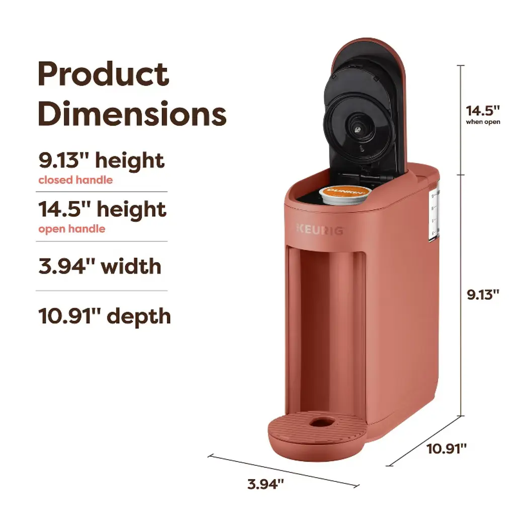 The Keurig K-Mini Mate Single Serve Coffee Maker is tiny but mighty with big flavor in an unbelievably small package. Don’t let its size fool you – this modern, sleekly designed brewer is a one-cup coffee maker that brews the perfect tasting cup. Complete with the same brewing technology as many bigger Keurig coffee machines, this mini coffee companion brews a cup up to 12oz with the flavor you love from any of our hundreds of K-Cup pod varieties. At just 4" wide, it's the smallest Keurig brewer ever, making it a major space-saver when it comes to your daily cup. Perfect for small kitchens, dorm rooms, and tiny apartments, the K-Mini Mate brewer’s compact design means it can fit almost anywhere you might want to place it. Whether you’re at home or just want to make somewhere feel like home, the K-Mini Mate brewer is your perfect travel companion. Just plug it in and you’ll have the convenience and coffee quality you love about Keurig brewers.