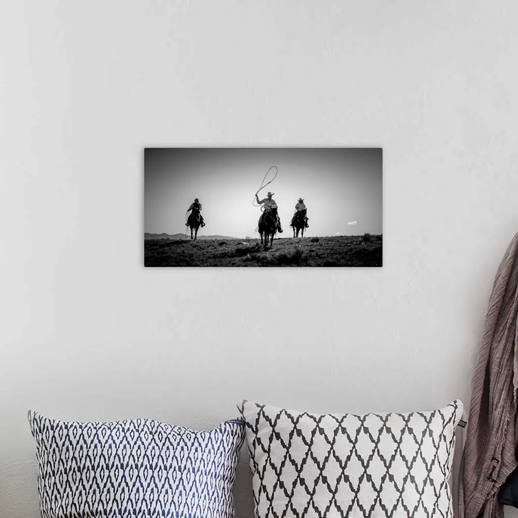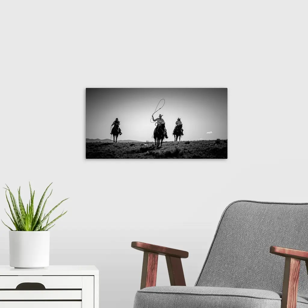 Black and white photograph of three cow girls on horseback with their lassos out.