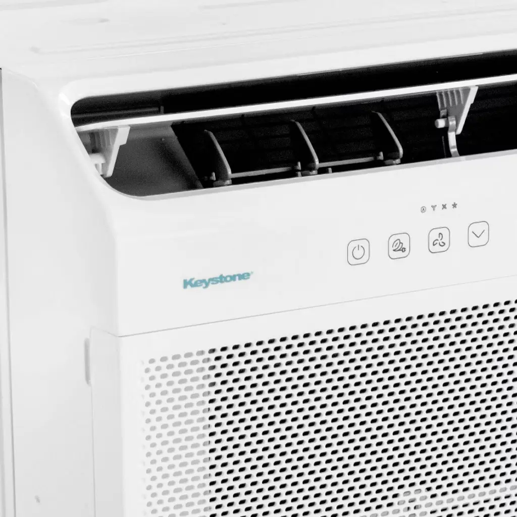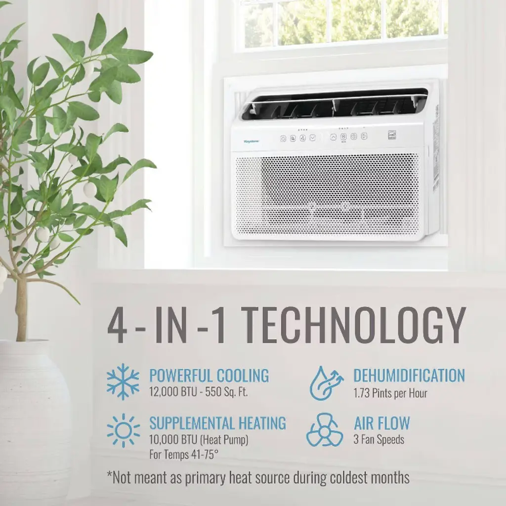 With reliable air conditioning units, Keystone produces consistent cooling to keep you comfortable, even on the hottest days. This 12,000 BTU inverter window-mounted air conditioner can effectively cool rooms up to 550 square feet with dehumidification up to 1.73 pints per hour to remove moisture from the air. Perfect for medium-sized living spaces like apartments, bedrooms, living rooms, and much more. A 10,000 BTU heat pump is also included for those chilly days. Supplemental Heating mode is meant to be operated when temperatures outside are between 41 and 75 degrees. This mode is supplemental and NOT meant as a primary heat source. It features special Inverter technology to eliminate wasted operation in the air conditioner by controlling the motor speed to exactly the amount of power that is needed to keep the room at the desired temperature. In addition, the inverter technology also makes this unit 18% more energy efficient than standard window units. A remote is included so you can control your cooling from across the room. Money saving features include energy saver mode, sleep mode, and a programmable 24-hour timer. You'll know when it's time to easily remove and clean the mesh filter with the Check Filter alert. Keystone not only provides a 1-year warranty but ensures that you stay cool and comfortable at a cost-conscious price.