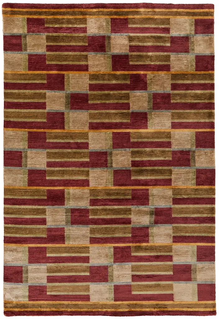 Collection: Keystone Colors: Green, Dark Red, Orange Construction: Hand Knotted Material: Face: Wool, Viscose Pile: Low Pile Pile Height: 0.39" Styles: Transitional,Mid-Century Modern Backing: N/A Made In: India Thickness: 0.39" Price Range: $$$$$ (Premium)