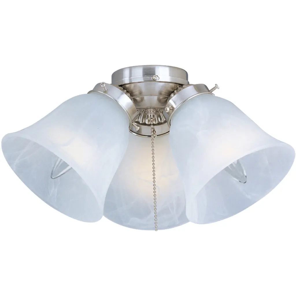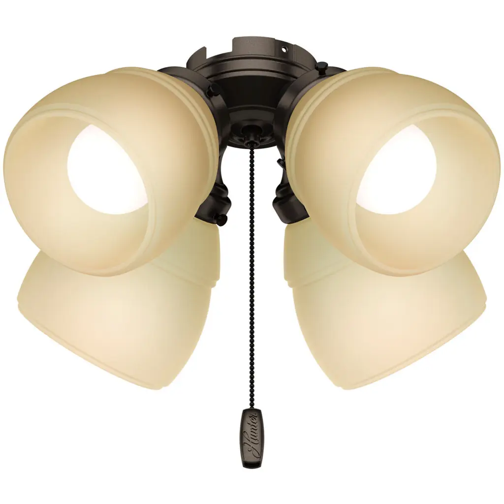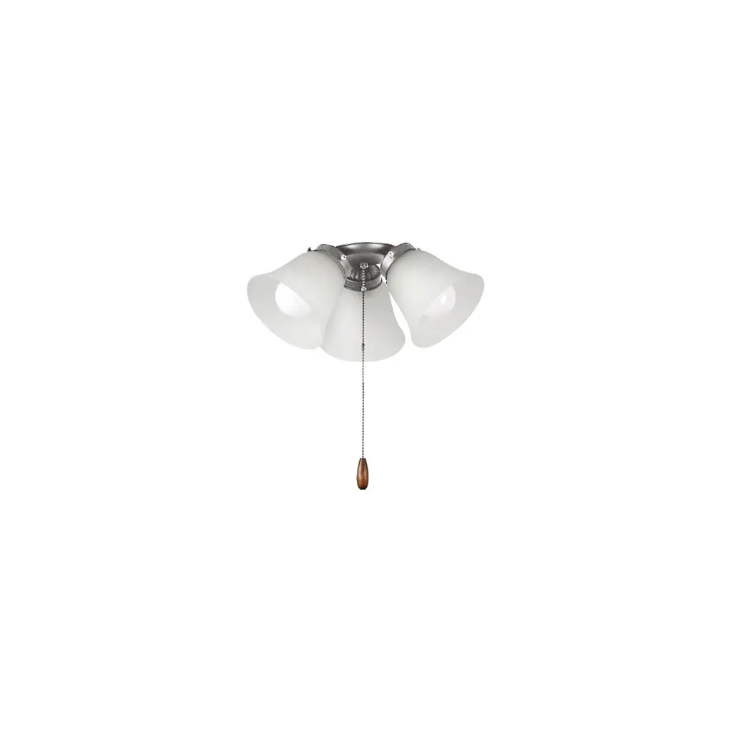 The final addition for all-encompassing comfort. Match the pleasant feel of your fan’s breeze with the soft, surrounding glow of the KGL400 Fan Light Kit from Wind River. The kit screws into the base of the fan for an easy install. It matches the aesthetics of the fan with solid metal hardware in a low profile. The frosted white glass shades delight in their bell-shaped silhouettes. The angled shades let outpouring light sweep across the room. The frosted surface of the glass charms with a golden hue.