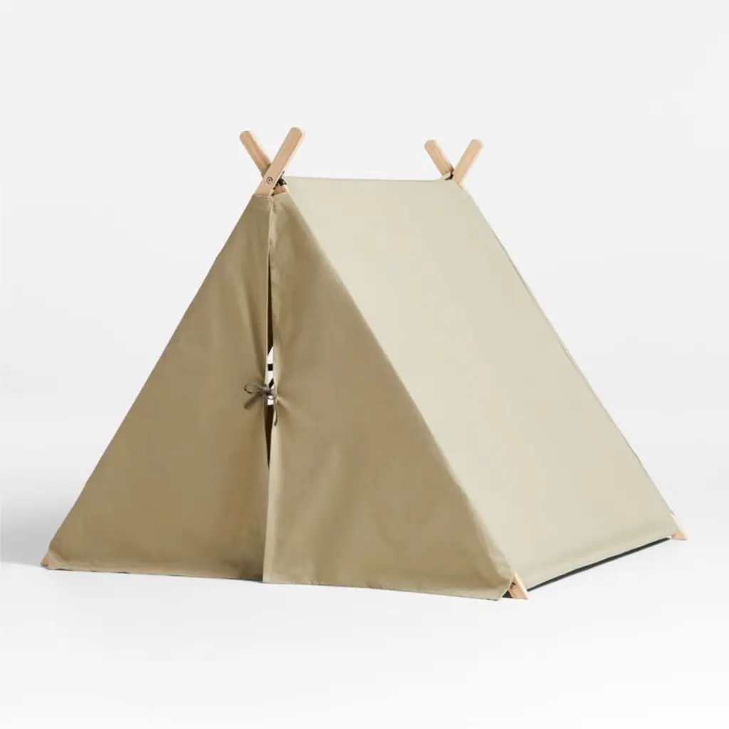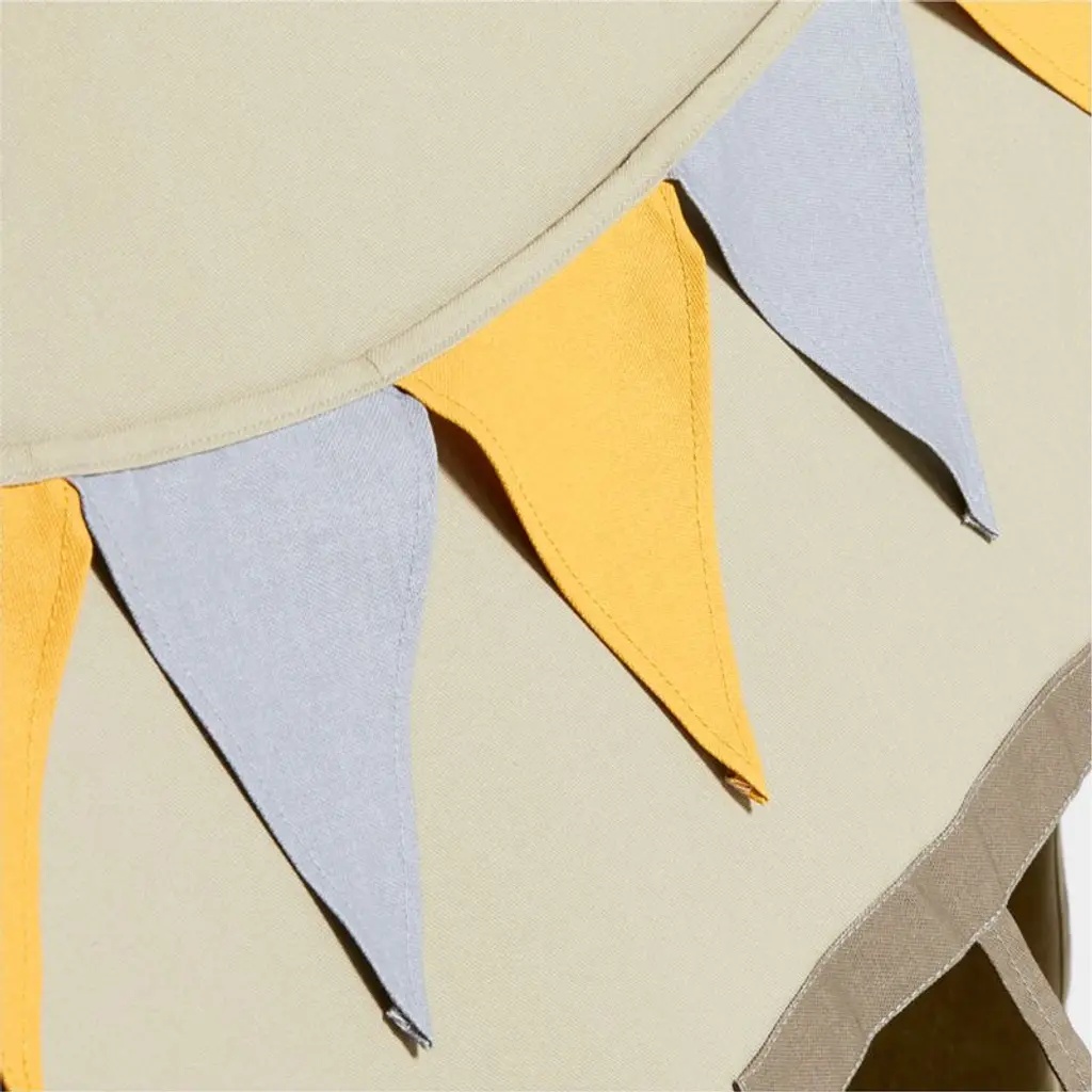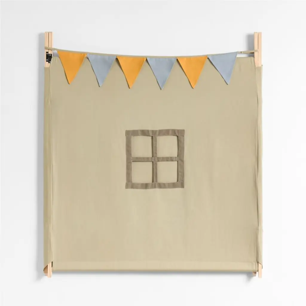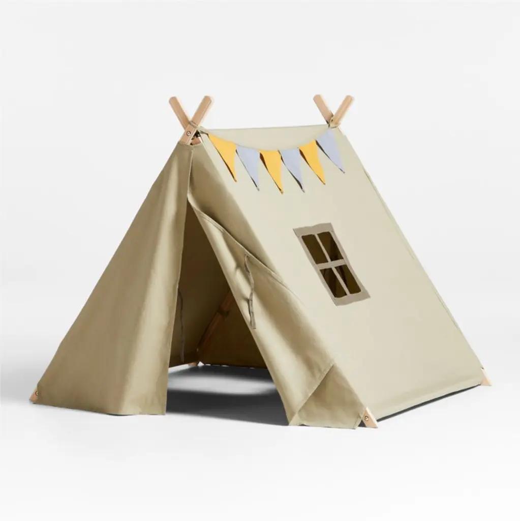 Our portable play tent promises years of rainy day adventures and magical backyard moments. The khaki green cover is woven of durable cotton, with a flap door for easy access and a window to let the breeze come through. It comes with a removable flag garland for added flair and can be personalized with a child's name on it for an extra-special touch. And when playtime's over, the tent collapses in a snap for space-saving storage.