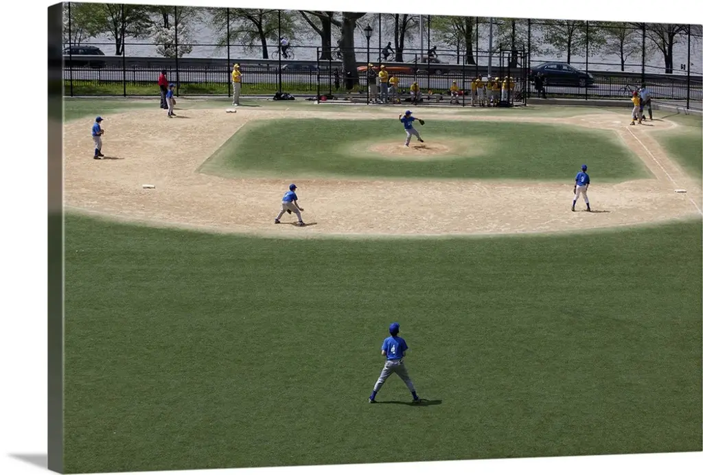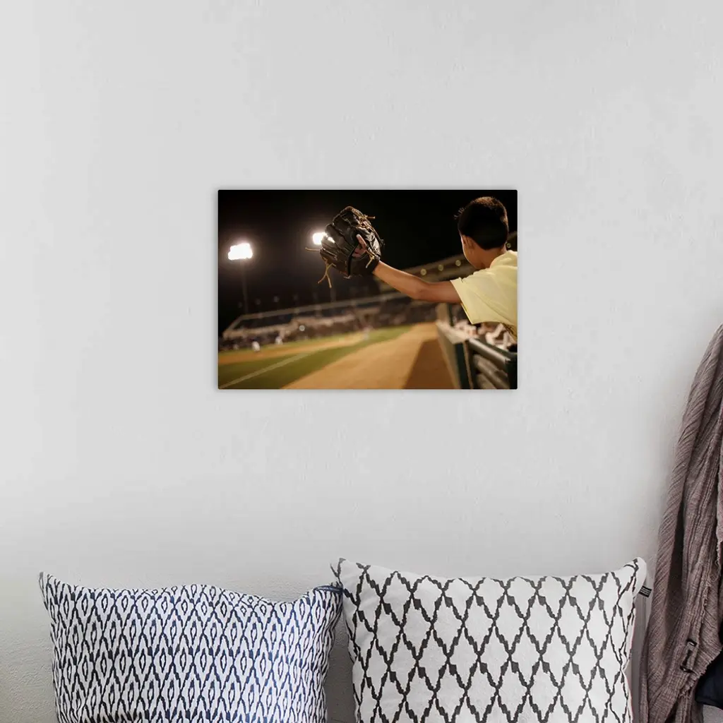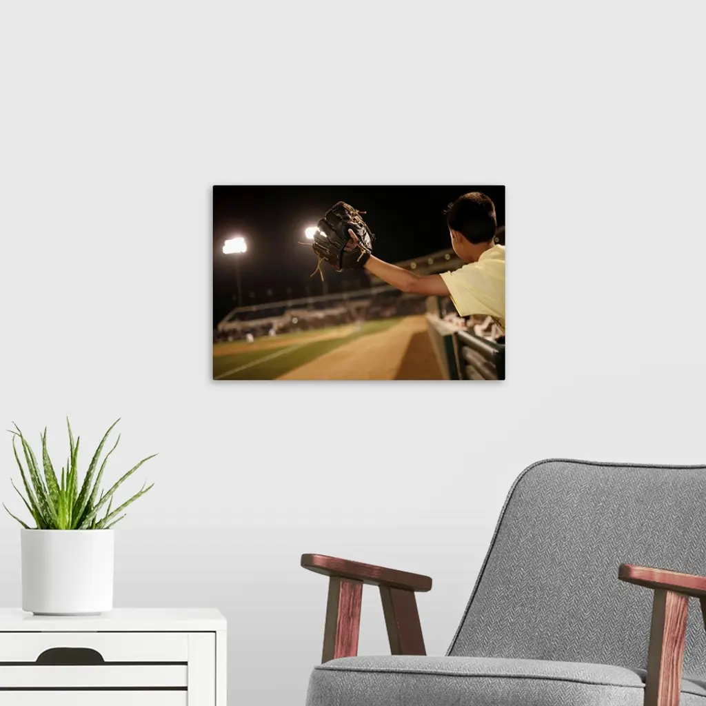 Kid Leaning Over Wall To Try And Catch 'Foul 'Ball At Nighttime Baseball Game