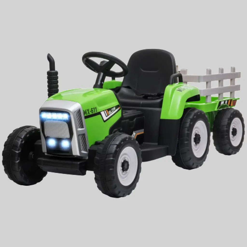 Product Introduction: Give your child the joy of driving their own electric tractor with this 12V ride-on model. With dual 25W motors, a detachable back trailer, and plenty of fun features like music, a horn, and LED headlights, this tractor is designed for kids aged 3-6. The remote control allows parents to supervise playtime, ensuring safety while adding an extra layer of enjoyment.Product Features: Specifications: Note: Assembly is required. 2 x 1.5V AAA batteries for music not included. Meets ASTM F963 and CPSIA safety standards.