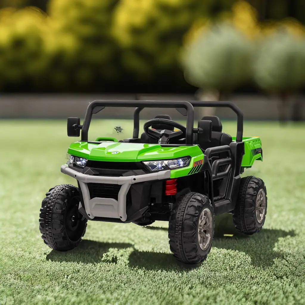 24V Electric Ride-On Dump Truck for Kids with Two Seats, Remote Control & Shovel This 24V ride-on dump truck for kids brings the exciting world of construction vehicles to life! With realistic features like a working dump bed, small shovel, openable doors, and storage space, your child will have endless fun pretending to be a construction worker. Perfect for kids ages 3-8, this truck provides a fun and safe way for your child to explore their imagination while they ride.Realistic and Durable This ride-on truck features shock-absorbing tires that ensure a smooth ride across different terrains. The truck's realistic design includes LED lights, built-in music, and a small shovel for interactive play. The dump bed can be loaded and unloaded for hours of fun!Powerful & Safe Powered by a 24V battery and two 550W motors, this truck can reach speeds between 3-7 km/h. Parents can control the truck with the remote control, while the three-point safety belt ensures your child's safety. The truck can carry up to 110 lbs, comfortably fitting two children.Specifications: The Perfect Gift: This 24V ride-on dump truck is a perfect gift for any child who loves construction-themed adventures and realistic play!