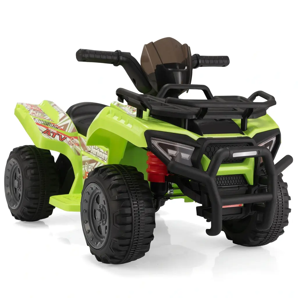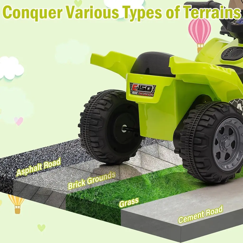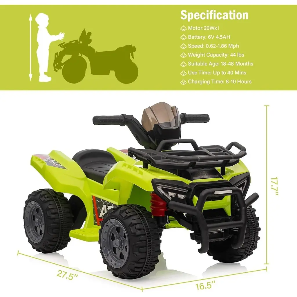 AUTHENTIC ATV DESIGN: With its true-to-life off-road style and realistic engine sounds, this kids' ATV delivers impressive power across all four wheels, making it ready to conquer grass, dirt, driveways, and sidewalks. Your toddler will feel like a cool little racer in no time MUSIC FUN: This toddler 4-wheeler features an AUX input and USB port, letting your little ones jam to their favorite tunes or listen to stories as they drive. It's the perfect way to add extra excitement to their ATV riding experience PERFECT FOR LITTLE ONES: Kids can start their 6V ride-on toy by pressing the handy start button on the handlebar, ensuring a safe and easy experience. Tailored for children aged 18-48 months, it allows toddlers to discover the joy of riding both indoors and outdoors RECHARGEABLE 6V 4.5AH BATTERY: This toddler four-wheeler features a 6V 4.5AH rechargeable battery, providing up to 40 minutes of ride time and speeds of up to 1.86 mph for a safe and enjoyable experience. Dimensions: 27.5" L x 16.5" W x 17.7" H. Weight capacity: 55 lbs. SAFE AND COMFORTABLE: The 6V kids' ATV ride-on four-wheeler features spring suspension for a smooth ride and bumpers to help prevent accidents. Constructed from durable PP material and ASTM certified, this kids' four-wheeler is the ideal gift for parents who want to ensure their children have a safe and enjoyable ride