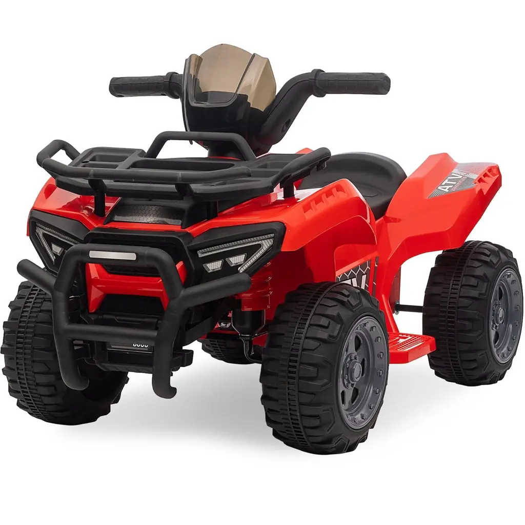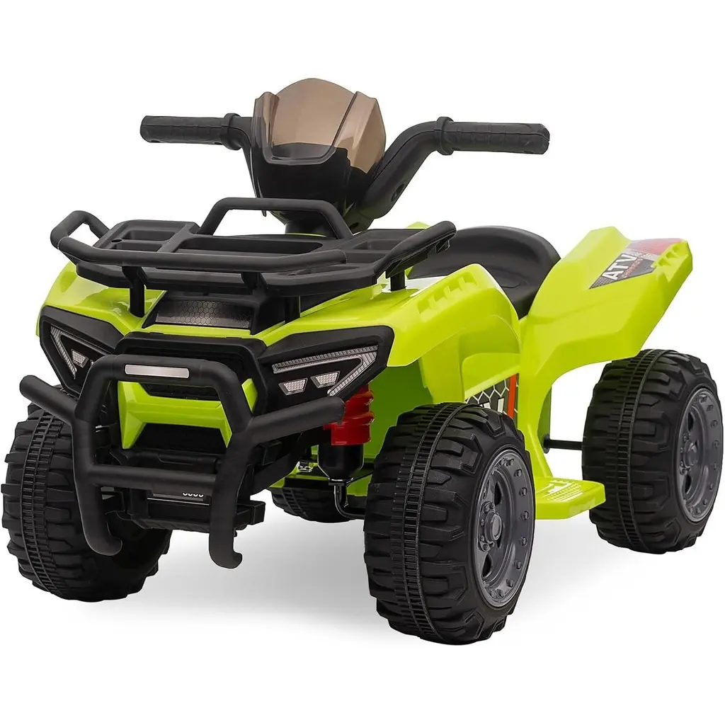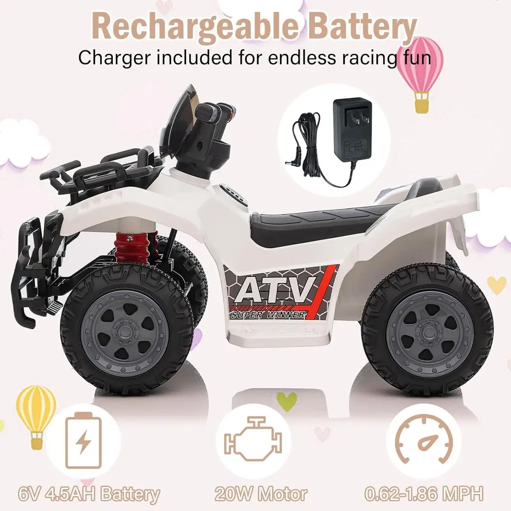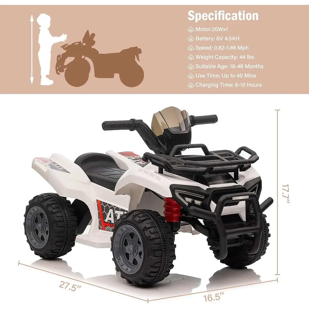 AUTHENTIC ATV DESIGN: With its true-to-life off-road style and realistic engine sounds, this kids' ATV delivers impressive power across all four wheels, making it ready to conquer grass, dirt, driveways, and sidewalks. Your toddler will feel like a cool little racer in no time MUSIC FUN: This toddler 4-wheeler features an AUX input and USB port, letting your little ones jam to their favorite tunes or listen to stories as they drive. It's the perfect way to add extra excitement to their ATV riding experience PERFECT FOR LITTLE ONES: Kids can start their 6V ride-on toy by pressing the handy start button on the handlebar, ensuring a safe and easy experience. Tailored for children aged 18-48 months, it allows toddlers to discover the joy of riding both indoors and outdoors RECHARGEABLE 6V 4.5AH BATTERY: This toddler four-wheeler features a 6V 4.5AH rechargeable battery, providing up to 40 minutes of ride time and speeds of up to 1.86 mph for a safe and enjoyable experience. Dimensions: 27.5" L x 16.5" W x 17.7" H. Weight capacity: 55 lbs. SAFE AND COMFORTABLE: The 6V kids' ATV ride-on four-wheeler features spring suspension for a smooth ride and bumpers to help prevent accidents. Constructed from durable PP material and ASTM certified, this kids' four-wheeler is the ideal gift for parents who want to ensure their children have a safe and enjoyable ride
