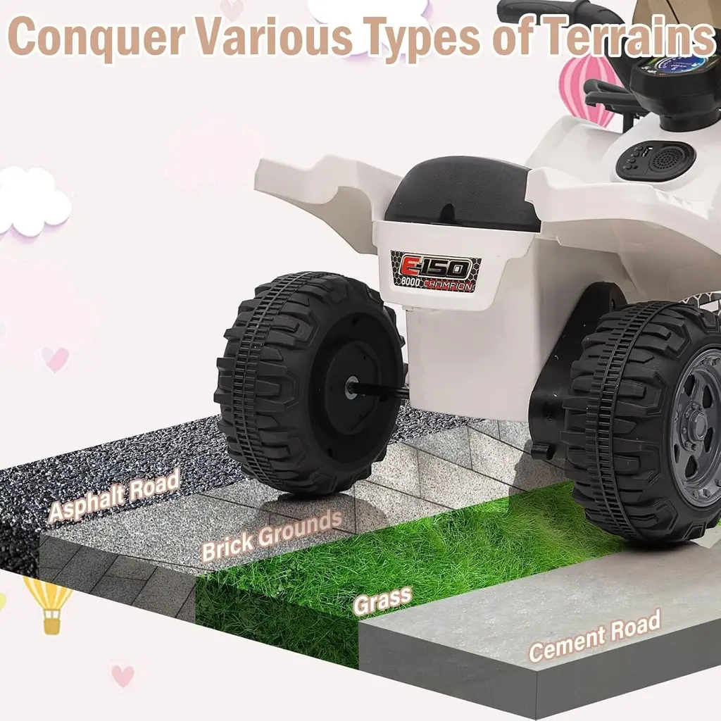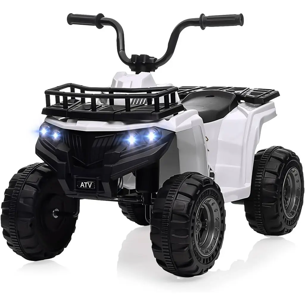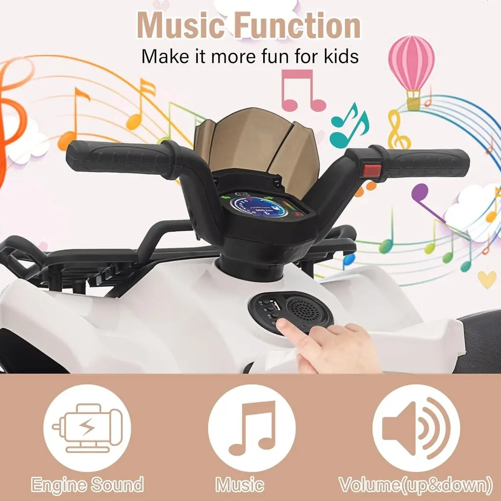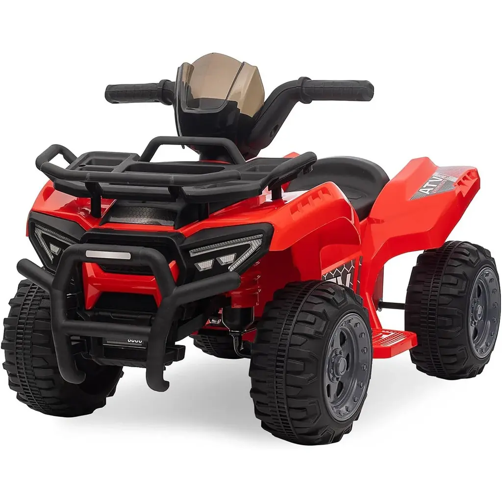 AUTHENTIC ATV DESIGN: With its true-to-life off-road style and realistic engine sounds, this kids' ATV delivers impressive power across all four wheels, making it ready to conquer grass, dirt, driveways, and sidewalks. Your toddler will feel like a cool little racer in no time MUSIC FUN: This toddler 4-wheeler features an AUX input and USB port, letting your little ones jam to their favorite tunes or listen to stories as they drive. It's the perfect way to add extra excitement to their ATV riding experience PERFECT FOR LITTLE ONES: Kids can start their 6V ride-on toy by pressing the handy start button on the handlebar, ensuring a safe and easy experience. Tailored for children aged 18-48 months, it allows toddlers to discover the joy of riding both indoors and outdoors RECHARGEABLE 6V 4.5AH BATTERY: This toddler four-wheeler features a 6V 4.5AH rechargeable battery, providing up to 40 minutes of ride time and speeds of up to 1.86 mph for a safe and enjoyable experience. Dimensions: 27.5" L x 16.5" W x 17.7" H. Weight capacity: 55 lbs. SAFE AND COMFORTABLE: The 6V kids' ATV ride-on four-wheeler features spring suspension for a smooth ride and bumpers to help prevent accidents. Constructed from durable PP material and ASTM certified, this kids' four-wheeler is the ideal gift for parents who want to ensure their children have a safe and enjoyable ride