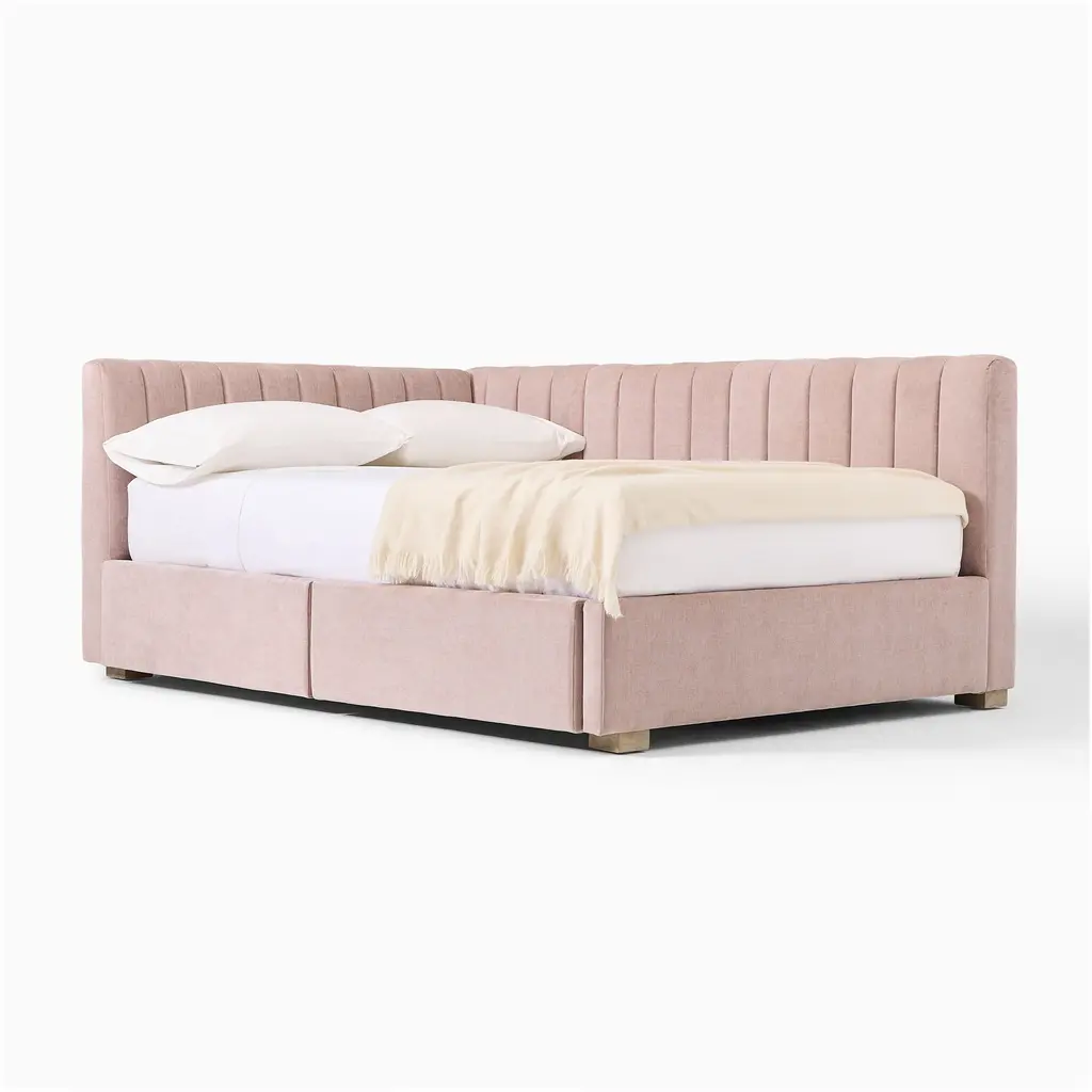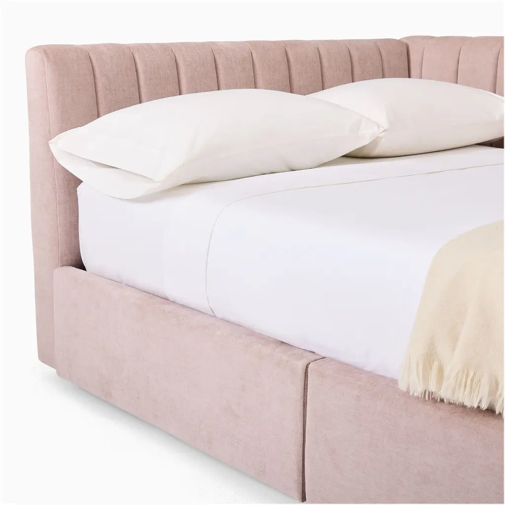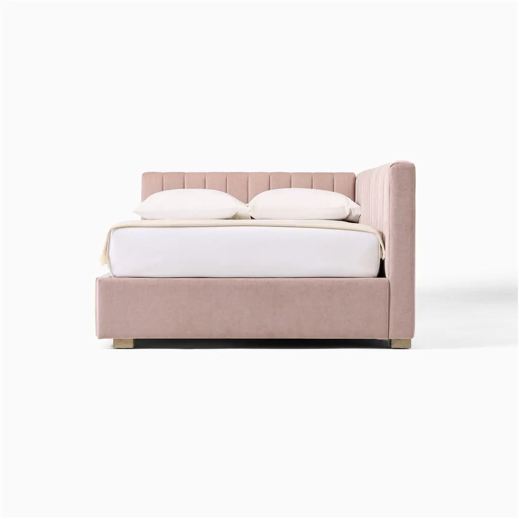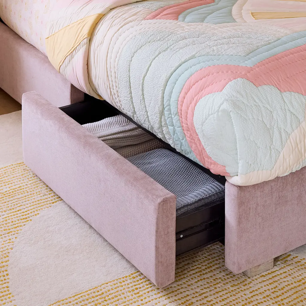 Upholstered in plush, vertical tufted fabric or vegan leather. Creates a cozy corner in any room. Its side drawers provide discrete storage. It's GREENGUARD Gold Certified as being low VOC.