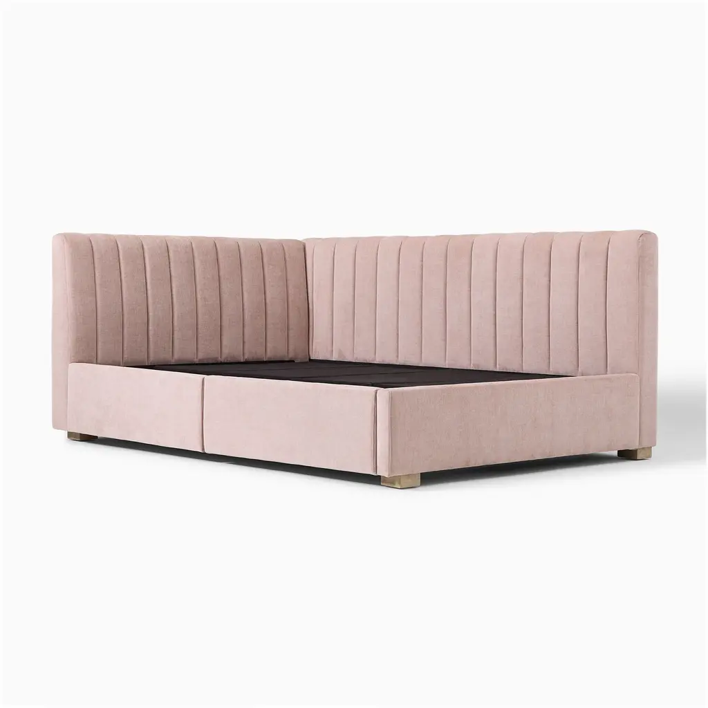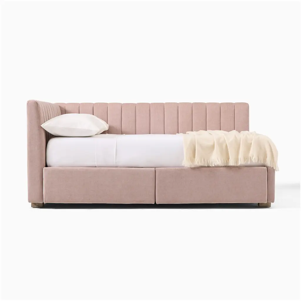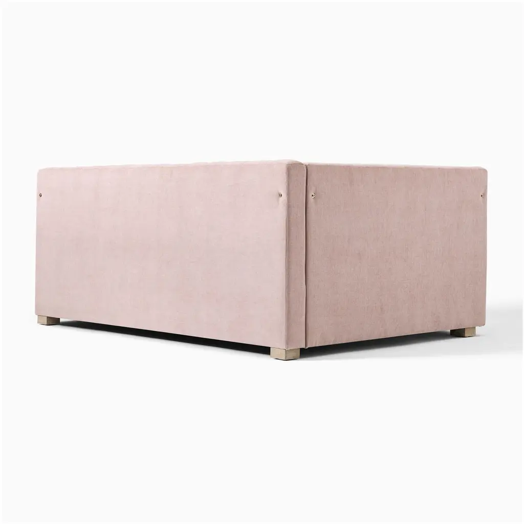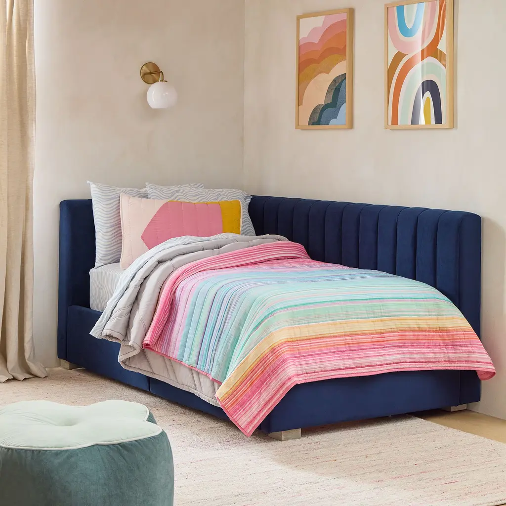 Upholstered in plush, vertical tufted fabric or vegan leather. Creates a cozy corner in any room. Its side drawers provide discrete storage. It's GREENGUARD Gold Certified as being low VOC.