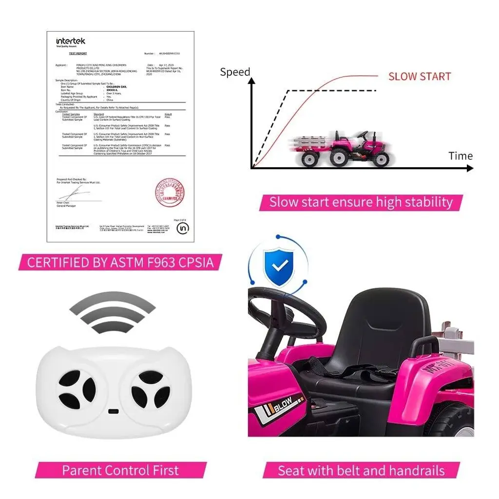 ??Manual & Parental Control-- The parent can control the tractor to enjoy the happiness time with child. Of course, the child also can operate the vehicle by themself by foot pedal and 3 gear sysetem to control ideal speeds. ??Safety Guarantee--This kids ride on tractor certified by ASTM F963 CPSIA CPC, with slow start function,parent remote control, ajustable seat belt , all these can make sure to prevent your child from falling off or other danger. ??Upgrade Version--The 35W configure with EVA tires, the tires are more powerful and quiet to ride and enable smooth driving on various road surfaces, ideal for indoor and outdoor play. ??Build-in Fun--The ride on vehicle already assembled with Realistic engine sound,Horn,Music,MP3,USB port, TF card,Battery indicator, Bluetooth function,make sure your child has more fun in driving. ??Realistic Tractor Design--Bright 7-LED headlights,control padel,realistic 2+1 gear shift, solid armrest,detatchable trailer, rechargable battery with 2*12V motor.Overall Dimensions:54"(L) x 20"(W) x 21"(H); Weight Capacity: 66 lbs. Recharge time: 8-12 hours.