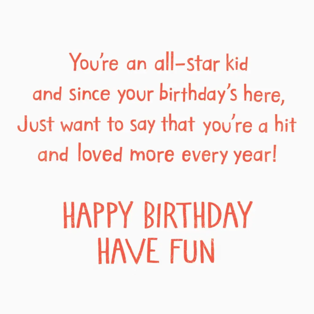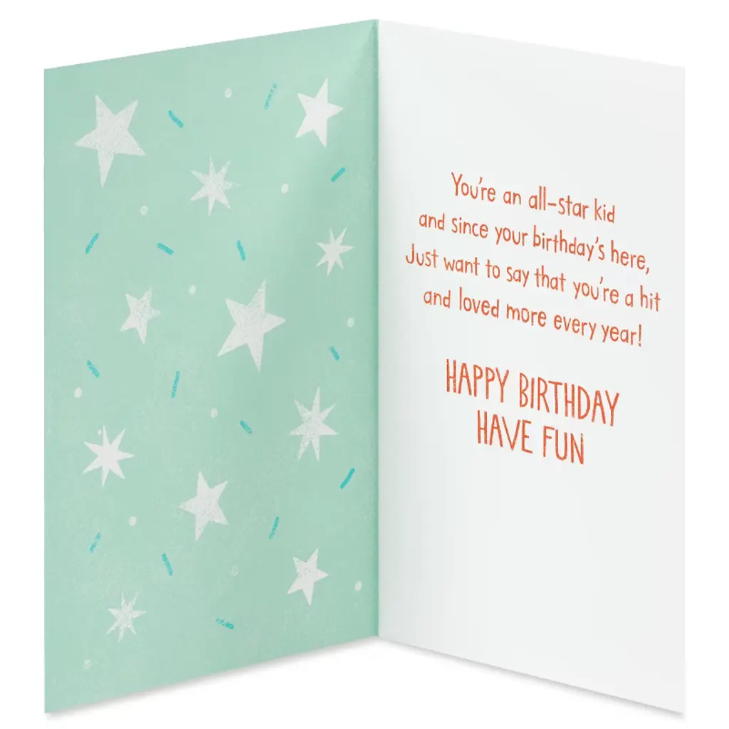 Make a big hit at any kid's birthday with this energetic 'Birthday MVP' card. Featuring a colorful foam finger design, it’s a perfect way to cheer on the birthday boy or girl, making them feel like the Most Valuable Player on their special day! Suitable for young sports fans, this card adds a playful touch to their birthday festivities. Includes an envelope for easy sending.