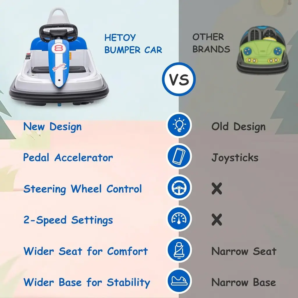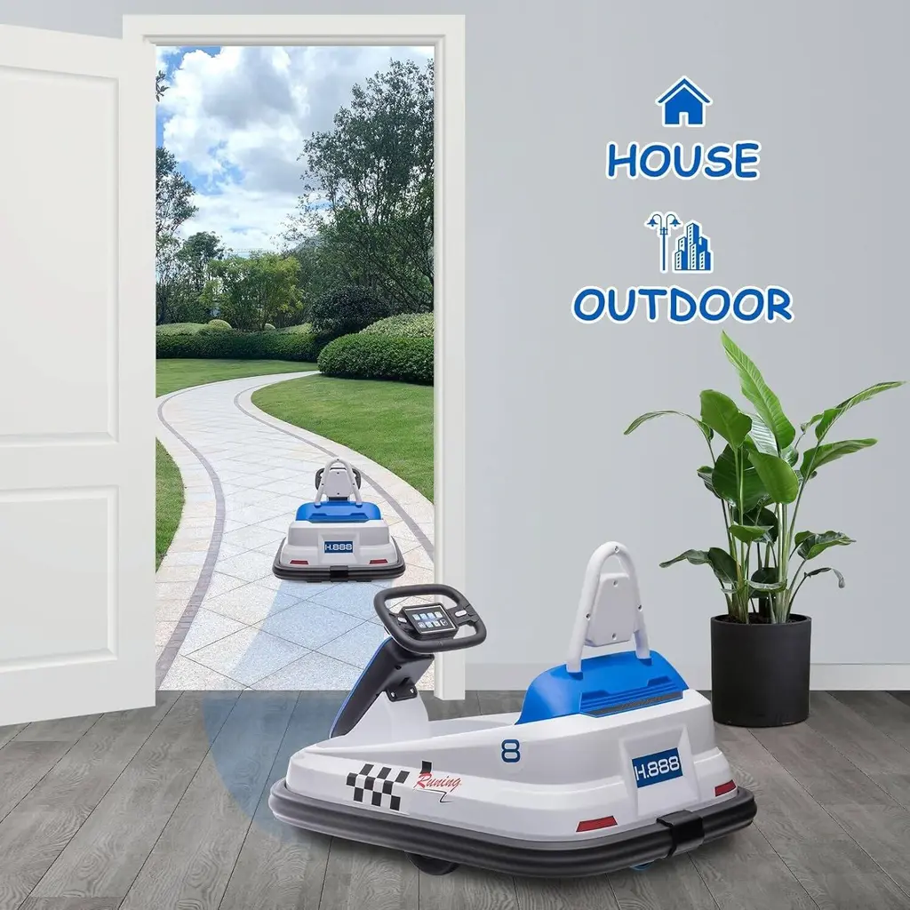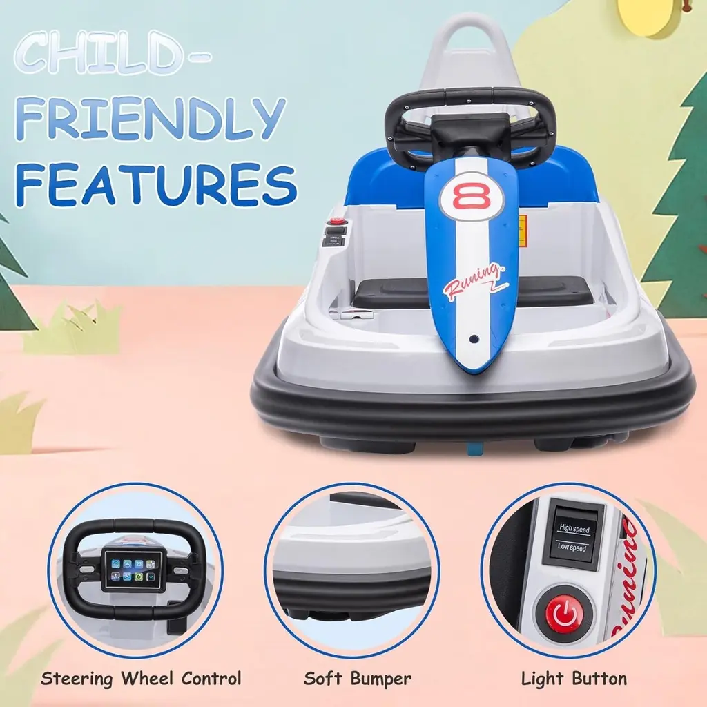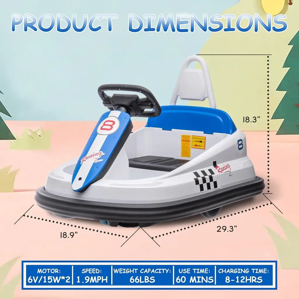 GET READY TO SPIN: This newly designed kids' bumper car features 360-degree spinning with easy steering wheel controls. Enhanced with fun light and sound effects, it replicates a fair experience. With a top speed of 1.9 mph, it's the perfect introduction to electric ride-on cars! COMPLETELY NEW DESIGN: Featuring a curved frame and thick rubber-like bumper, this toddler bumper car allows kids to race, chase, spin, and bump with ease. The steering wheel and pedal controls ensure worry-free, endless fun for your child on this 6V ride-on car. PREMIUM PERFORMANCE: This kids' car features forward/reverse and turn controls, along with music and horn functions for a fun and safe driving experience. It includes a rechargeable 6V battery, providing 1 hours of riding enjoyment after an 8-12 hour charging time. TOP SAFETY FEATURES: This ride-on bumper car for toddler includes an adjustable seat belt, anti-flat tires, and a durable plastic shell for enhanced safety. Its soft PVC rubber anti-collision strip protects both your child and your walls and furniture, making it a secure ride-on toy. IDEAL GIFT FOR BOYS & GIRLS: This 6V ride on toy is great for interactive and group play, allowing kids to bump each other for added fun. Overall dimensions are 29.3" (L) x 18.9" (W) x 18.3" (H) with a weight capacity of 66 lbs (NOTE: No remote control included).