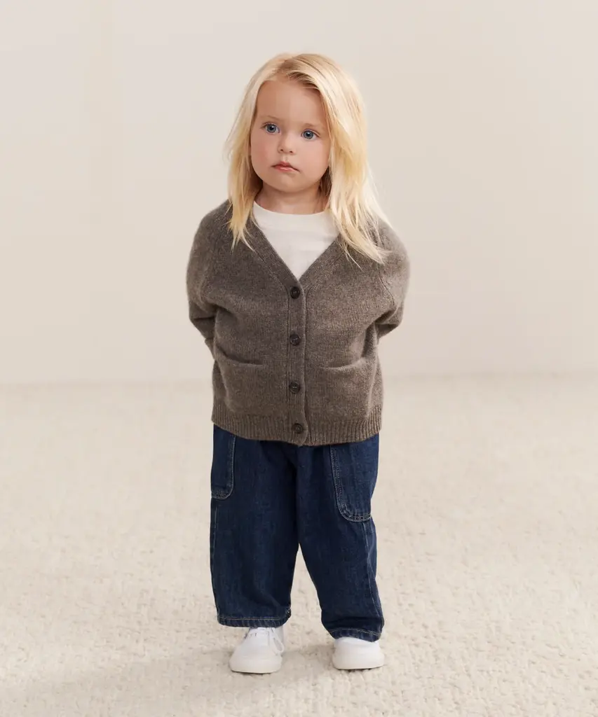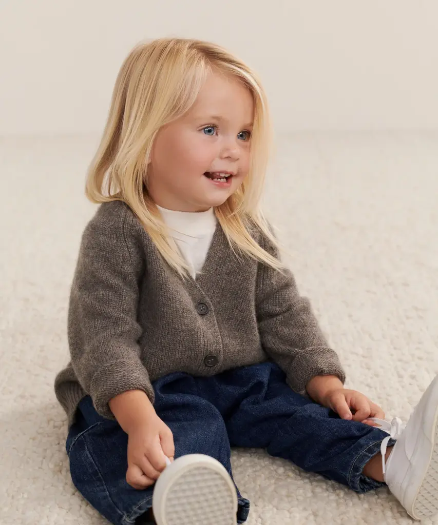 Kids' Cashmere Stanford Cardigan Shadow Cozy and comfortable, this knit is perfect for the little ones in your life. 100% cashmere. Made in China. Classic Stanford Cardigan in mini-me form.