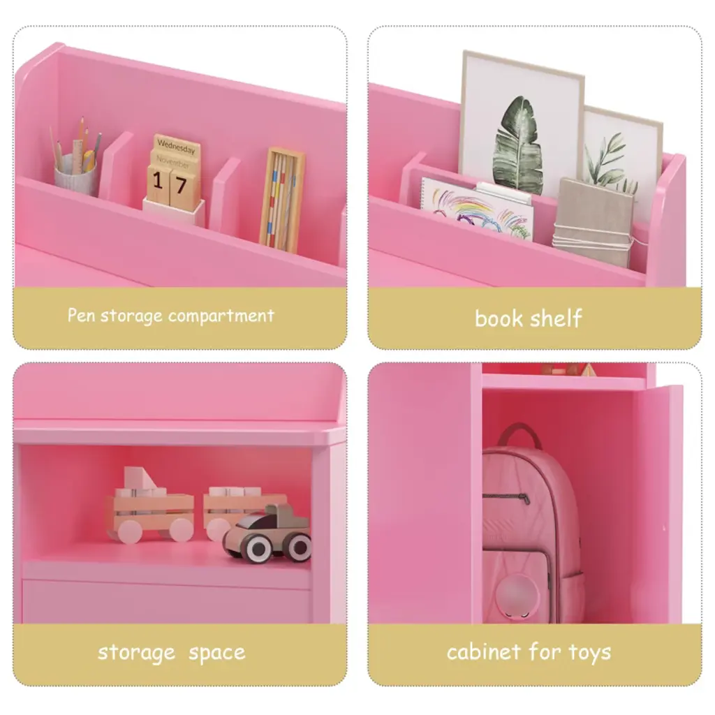 Kids Desk And Chair Set, Wooden Children Study Table With Storage Cabinet & Hutch, Student Writing Table Computer Workstation For 3-12 Years, Pink