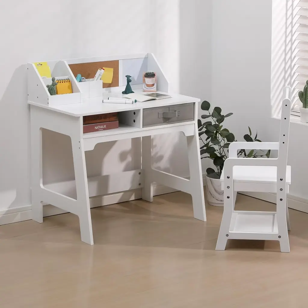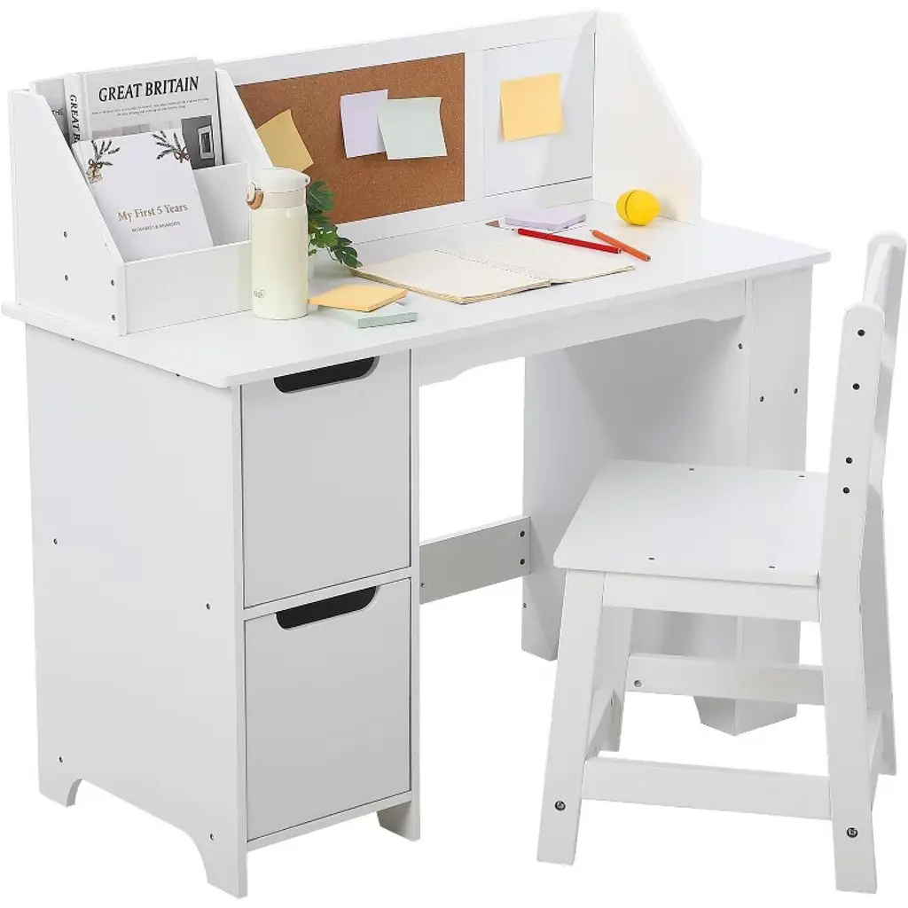 Kids Desk And Chair Set, Wooden Study Table With Storage Bins, Bookshelf, Bulletin Board, And Pen Holder, Writing Table , White