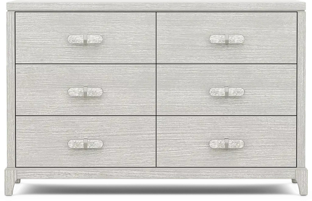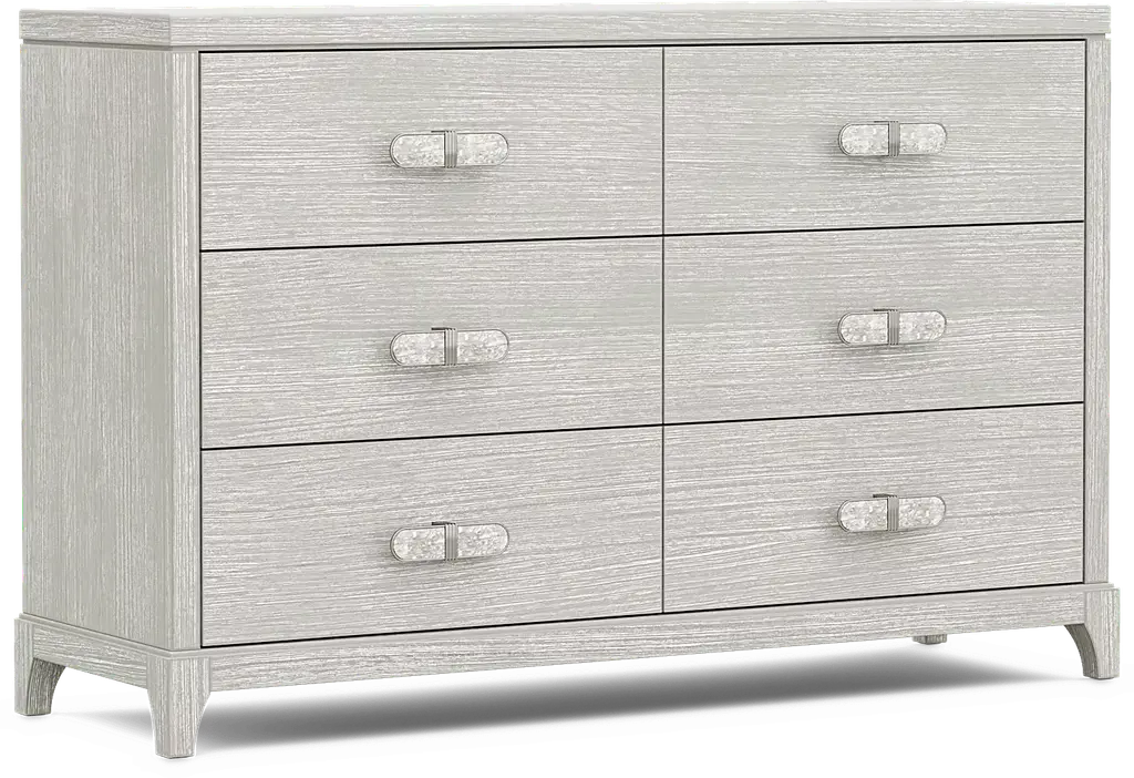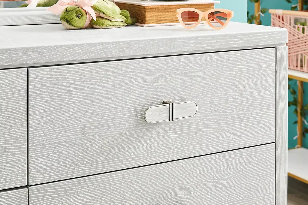 Cute for kids, perfect for teens and secretly the coolest style in the whole house, Emilie Rose is what happens when smart design meets major main character energy! Framed by a multi-colored LED strip, each of the upholstered headboards literally light up the room on command via touch or remote. You can also download the Lotus Lantern app and customize brightness, color and sync the lights to your music. The sides of the headboard are equipped with cubby storage and feature USB-A and USB-C fast charging ports. Crafted with a fresh wire-brushed gray finish, this sweet set is loaded with standout details like nickel pulls with elegant pearl-inspired insets on the six-drawer dresser. Built with English dovetail drawer construction and smooth center glides, the dresser is as durable as it is fierce. The look wouldn't be complete without the arched mirror, providing a beautiful surface for everything from selfies to getting ready for school. Mattresses and foundations (if required) sold separately.