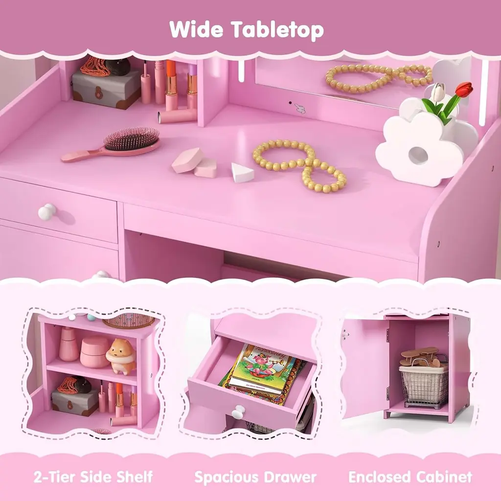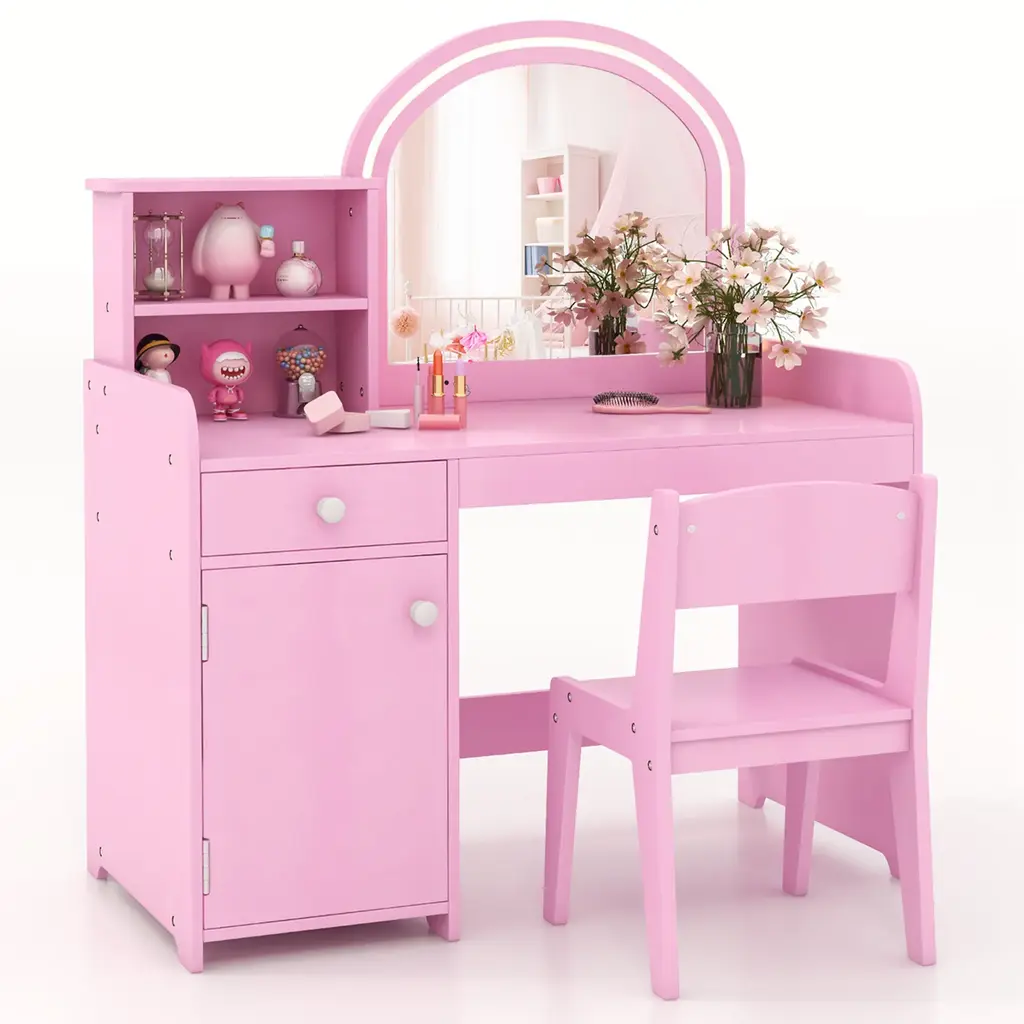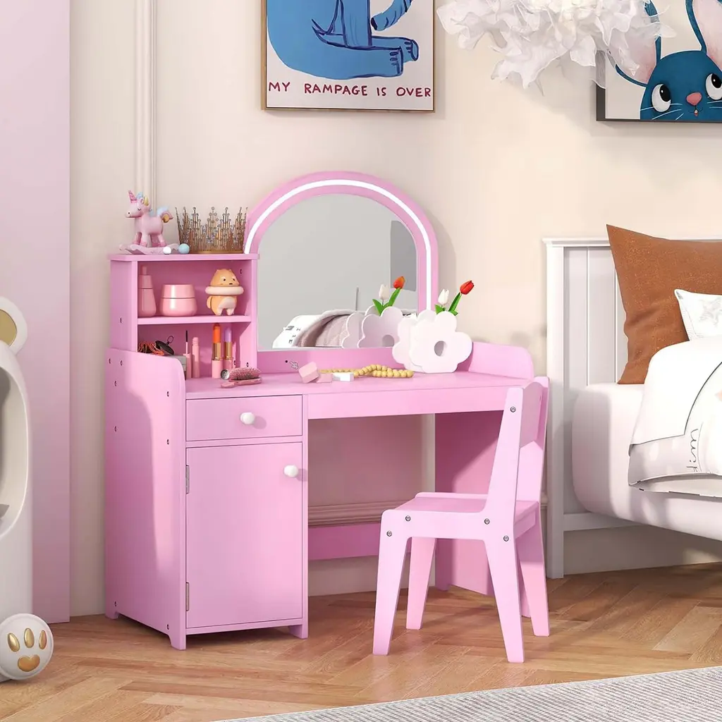 The kids vanity table set creates a magical experience with its lighted acrylic mirror. Adorned with 120 LED lights, the mirror can switch effortlessly between warm white & cool white light, transporting children into a world of enchantment. LED lights are energy-saving, low-voltage &much safer. Also, the acrylic mirror is secured to resist impact & shatter. Organizing is a breeze with the spacious 2-tier shelf, pull-out drawer& enclosed cabinet. Crafted from sturdy P2 MDF, the vanity table can support up to 165 lbs, while the chair can hold up to 110 lbs. Safety is prioritized with rounded corners& burr-free painted surfaces. Anchored securely to the wall with an anti-tipping kit, the kids makeup set is built for stability & peace of mind. The chair features a cozy backrest & a spacious seat, encouraging healthy sitting habits. Complete with metal hinges, user-friendly knobs& anti-slip foot pads, this makeup set allows for a safe & enjoyable experience. Features:Specification