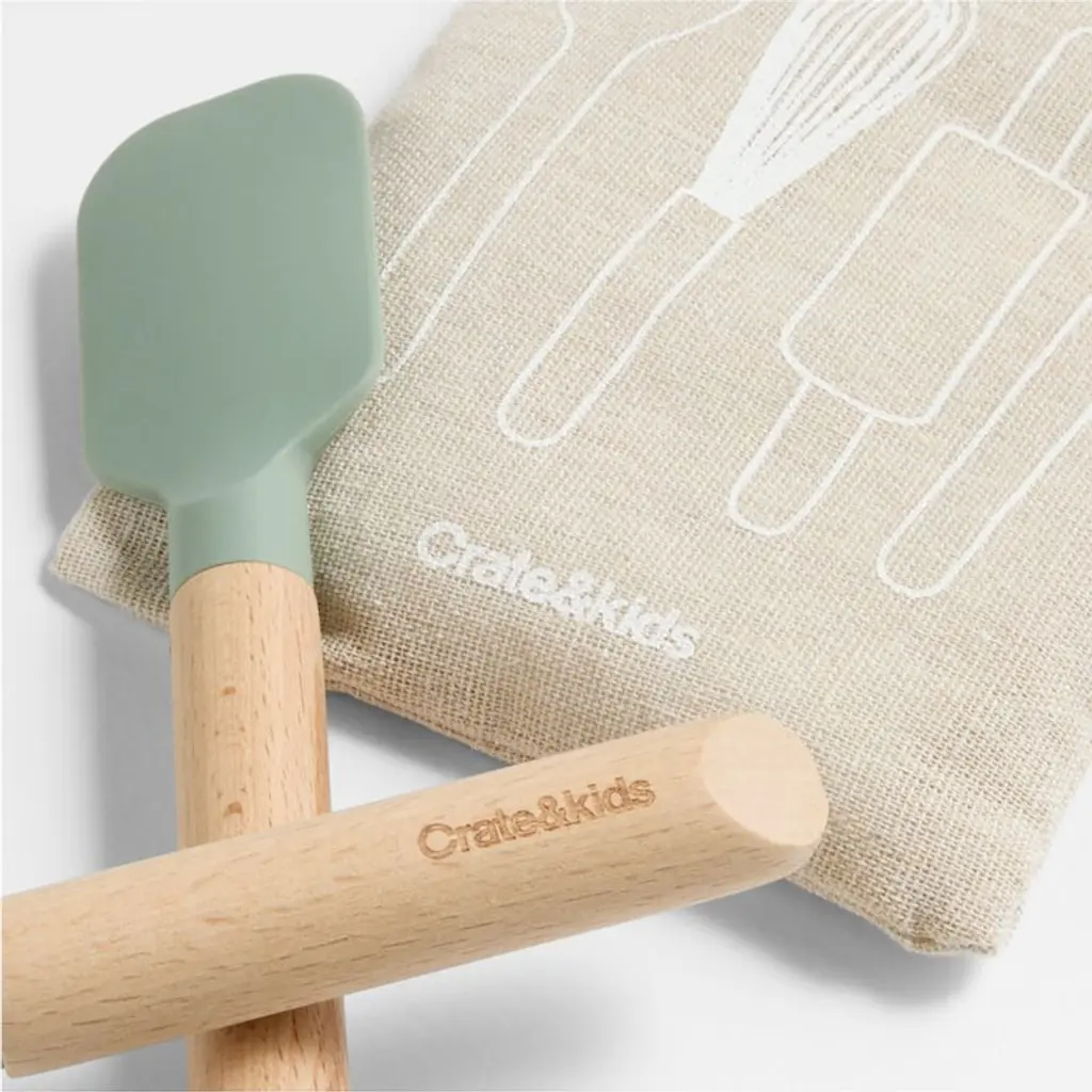 The secret recipe for getting kids to love cooking? Real tools that are just their size. Inspired by Crate & Barrel's adult kitchen line, this set of 4 utensils applies the same principles of functional, elevated design to tools for smaller hands. Solid beechwood handles and a silicone-coated barrel make our rolling pin a cinch for kids to use. The whisk's silicone-coated tines protect the surface of bowls when kids are enthusiastically mixing. Solid wood construction makes our spoon extra sturdy. And the spatula was designed to be ambidextrous (perfect for young kids who are still determining their dominant hand).