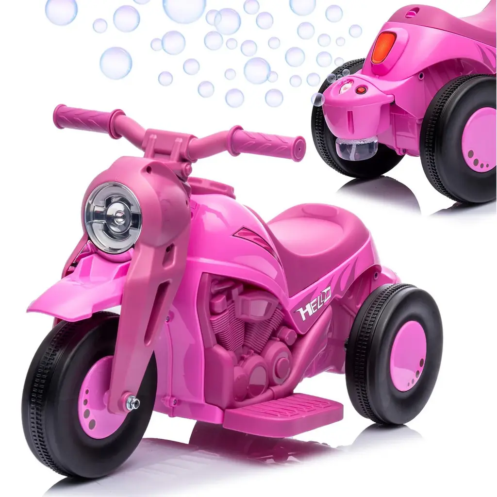 BUBBLE MACHINE: We have specially equipped the rear of this kids motorcycle with a bubble machine. Turn on the button, it can automatically generate colorful bubbles, easily create a wonderful atmosphere and bring more riding fun for kids. (Note: Bubble solution is not included) BATTERY POWERED MOTORCYCLE: This ride on toy is suitable for children over 3 years old, powered by 6V 4.5AH rechargeable batteries, which allows kids to enjoy about 1 hour of indoor and outdoor riding experience. Size: 31.5" x 14.4" x 16.9". Maximum weight capacity: 66 lbs. EASY TO RIDE: This 3 wheels electric car is smooth and simple, kids grab the handlebars, press the forward/stop/reverse buttons, step on the pedals, and it's ready to go! Equipped with a front light and music player. The child can enjoy the fun brought by bubbles and music. The LED light is convenient for night riding. SAFETY FIRST: The electric motorcycle has a charging protection function, when charging, all functions will be cut off. It is also equipped with an automatic reset fuse. When the vehicle is overloaded or operated incorrectly, the self-resetting fuse will be cut off for 5-20 seconds. GIFTS FOR BOYS & GIRLS: This rideon motorcycle is CPC and ASTM approved. Your child can drive the electric motorcycle in parks, playgrounds, yards and other places to enhance independence and coordination in play and fun. It is an ideal gift for your kids and will become a great companion to them.