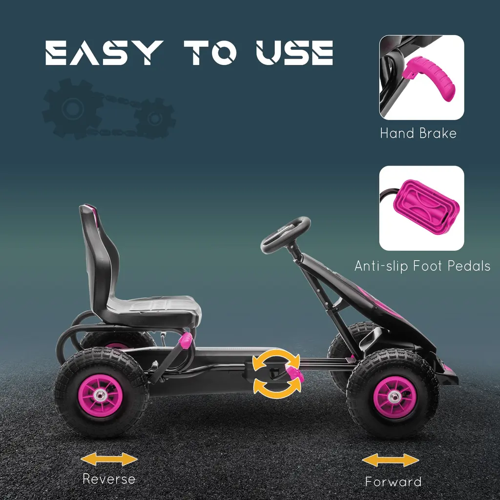 Kids Pedal Go-Kart With Ergonomic Seat And Suspension, Ages 5-12, Rubber Wheels, Safety Handbrake - Purple