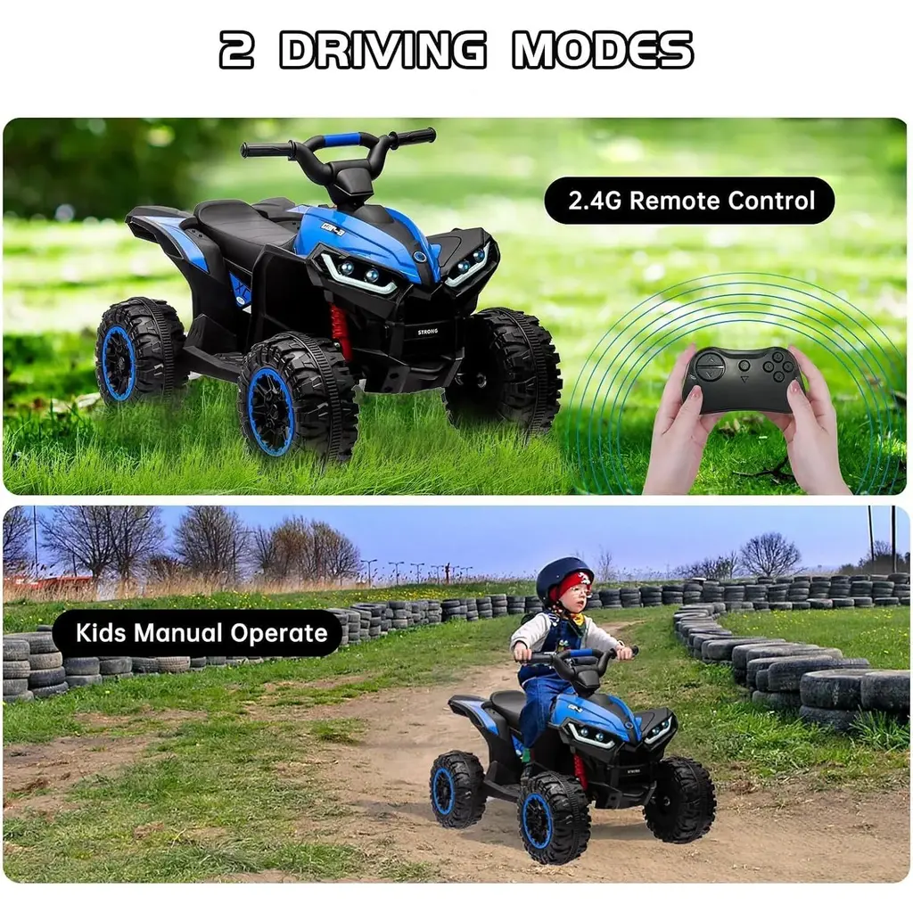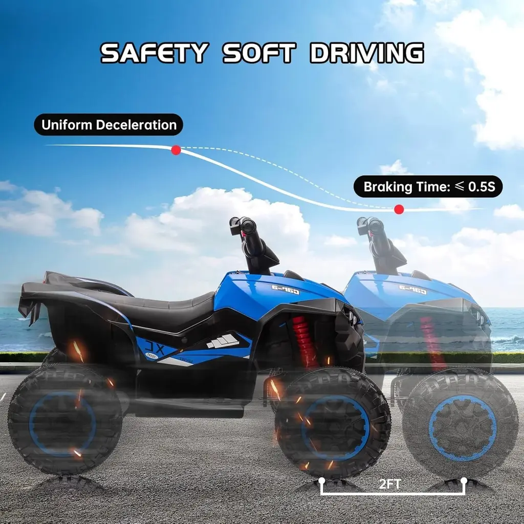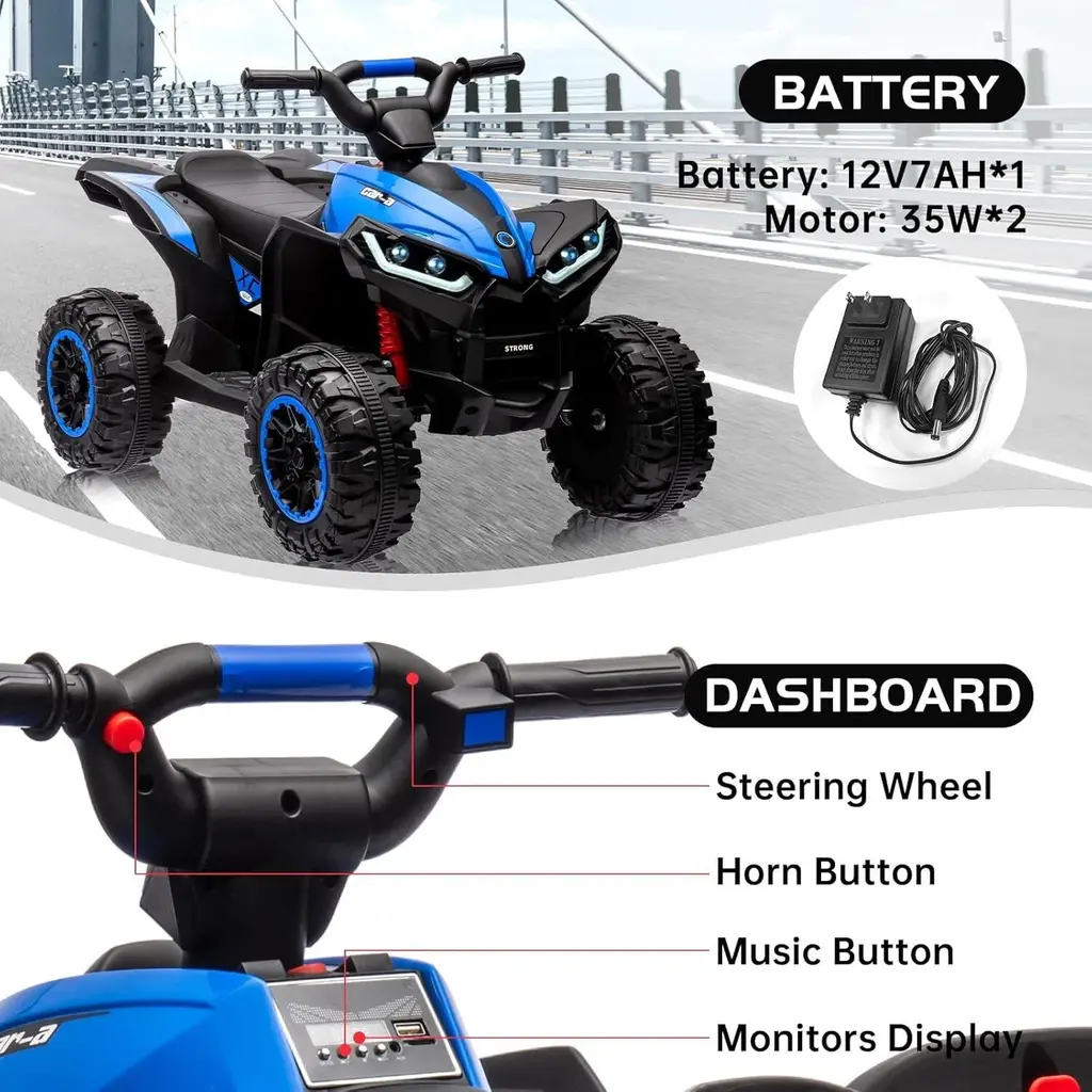 Dual Control Modes: This kid's 4WD ATV features a convenient remote control, enabling parents to guide their children during playtime. With forward and reverse functions and adjustable speed settings—offering 2 speed levels for the vehicle and 3 for the remote—children can experience the excitement of autonomous driving while parents maintain secure control when needed. Interactive Dashboard: The ATV is equipped with an interactive dashboard that elevates the driving experience with a variety of entertainment options. Children can enjoy a music learning module, volume control, and battery display, as well as connectivity features for MP3, TF card, USB, and Bluetooth. Realistic details like working headlights and interactive switches contribute to an immersive playtime adventure. Powerful Performance: Powered by two 35W high-performance motors and a 12V rechargeable battery, this electric ATV provides up to 2 hours of thrilling ride time on a single charge. Its textured wheels enhance traction, making it effective for both smooth surfaces and off-road environments like grass or asphalt, ensuring an exciting ride for young adventurers. Durable Large 4*Tires: Designed with high-quality, non-slip, and wear-resistant wheels, this ATV can effortlessly navigate various terrains. Kids can explore freely on grass, beaches, concrete paths, or asphalt, allowing for versatile and adventurous outdoor play while ensuring stability and safety. Safety and Comfort Features: This electric ATV incorporates advanced slow-start technology to prevent sudden acceleration, enhancing safety for young riders. Its ergonomically designed wide seat ensures comfort during rides, while specially designed foot pedals securely accommodate little feet, promoting a safe and enjoyable driving experience.