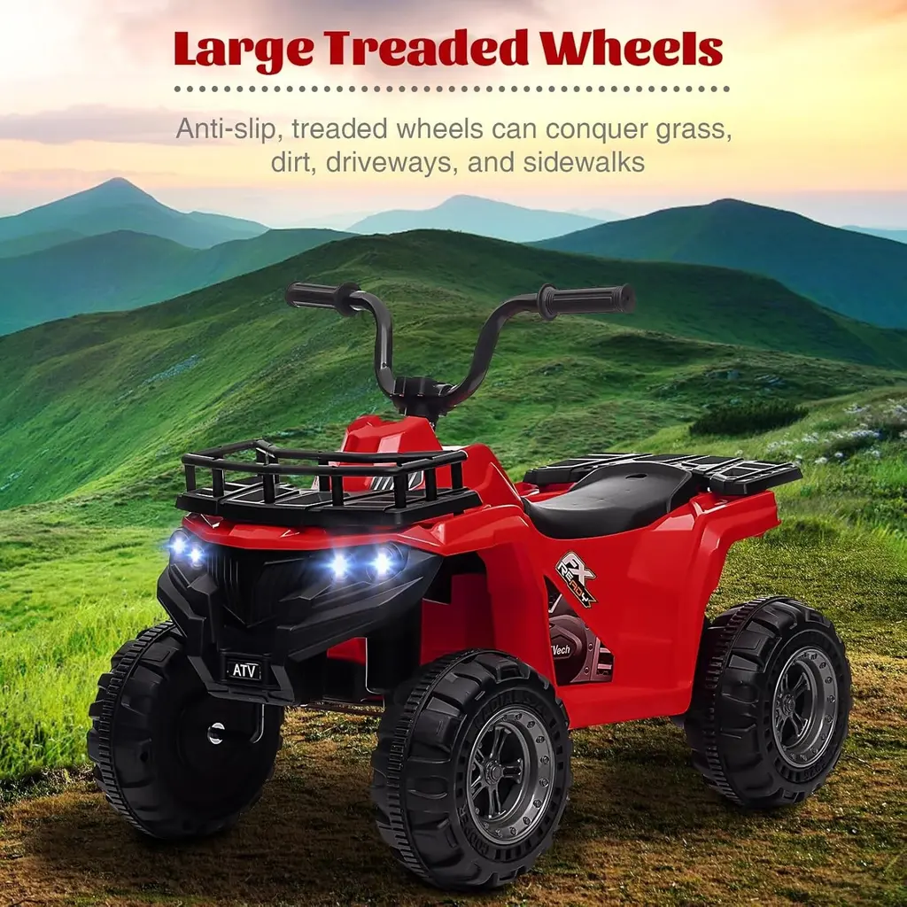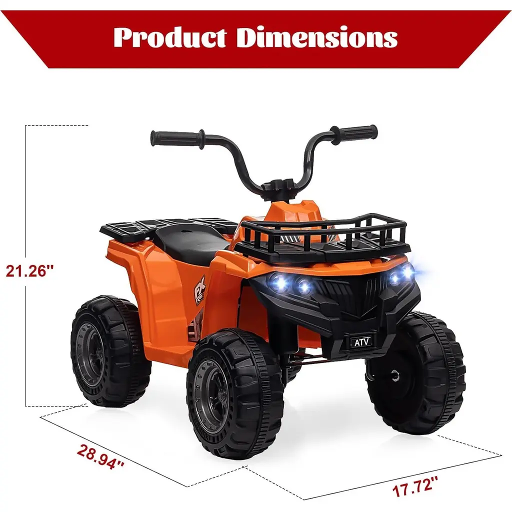 ORIGINAL ATV DESIGN: The Kids Ride On Electric Quad has a realistic all-terrain vehicle look, four wheels are powerful enough to adapt to a variety of terrains, allowing your child to have a real driving experience and turn into a cool little racer!RECYCLABLE 12V 7AH BATTERY: This walker can be ridden for up to 40 minutes on a full charge, with a speed range of 2.5-4.5-mph, perfect for kids to enjoy a safe and exciting riding experience.ENTERTAINMENT FEATURES: Our ride-on ATV is equipped with a variety of features to enhance the fun. It includes built-in speakers, LED headlights and music features for the most realistic driving experience.SAFETY AND COMFORT: The electric quad has spring suspension for a smooth ride and bumpers to protect against impacts. The electric Atv is also made of durable PP material and is ASTM certified to ensure its reliability, making it a trustworthy companion for your child's growth and play.