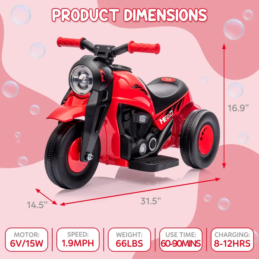 BUBBLE MACHINE: We have specially equipped the rear of this kids motorcycle with a bubble machine. Turn on the button, it can automatically generate colorful bubbles, easily create a wonderful atmosphere and bring more riding fun for kids. (Note: Bubble solution is not included)BATTERY POWERED MOTORCYCLE: This ride on toy is suitable for children over 3 years old, powered by 6V 4.5AH rechargeable batteries, which allows kids to enjoy about 1 hour of indoor and outdoor riding experience. Size: 31.5" x 14.4" x 16.9". Maximum weight capacity: 66 lbs.EASY TO RIDE: This 3 wheels electric car is smooth and simple, kids grab the handlebars, press the forward/stop/reverse buttons, step on the pedals, and it's ready to go! Equipped with a front light and music player. The child can enjoy the fun brought by bubbles and music. The LED light is convenient for night riding.SAFETY FIRST: The electric motorcycle has a charging protection function, when charging, all functions will be cut off. It is also equipped with an automatic reset fuse. When the vehicle is overloaded or operated incorrectly, the self-resetting fuse will be cut off for 5-20 seconds.GIFTS FOR BOYS & GIRLS: This rideon motorcycle is CPC and ASTM approved. Your child can drive the electric motorcycle in parks, playgrounds, yards and other places to enhance independence and coordination in play and fun. It is an ideal gift for your kids and will become a great companion to them.