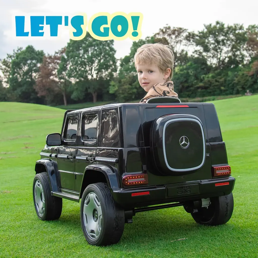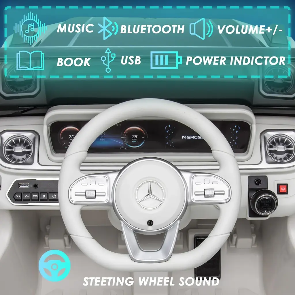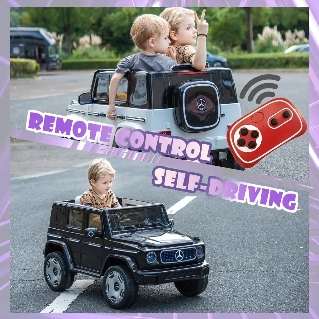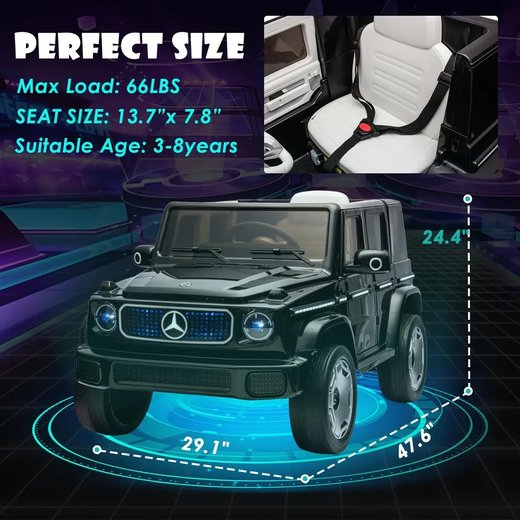 Licensed Mercedes-Benz: The electric kids ride-on car is a licensed ride-on toy that is designed inspired by the iconic off-road SUV Mercedes-Benz EQG. It has a realistic appearance, with a detailed grille, logo, headlights, taillights, and wheels. Powerful Performance: The Kids Electric Vehicles is powered by a 12V 9AH battery with two 45W motors, and has a shock absorber system, which can provide a smooth and powerful performance. The battery is removable and easy to charge, so you don't have to worry about running out of power. Safety is Priority: Our Kids Electric Vehicles is suitable for kids aged 3 to 8 years old, and it can support up to 66 lbs of weight. It has a three-point safety belt, which can keep your kids secure and comfortable. The headlights brighten the road in case dusk hits. Dual Control Options: You can choose to let your kids drive by themselves, using the steering wheel and the foot pedal, or you can control the car remotely, using the 2.4G wireless remote controller. The remote controller has forward, backward, left, right, and stop buttons. You can also switch between the two modes at any time, giving you more flexibility and safety. Inside Experience: It also has a spacious interior, with one comfortable seat(13.7"x 7.8"), a steering wheel, a dashboard, and a multimedia panel. The multimedia panel can play music, stories, or sounds, and it has a USB port, an SD card slot, and an AUX input. Your kids will love listening to their favorite tunes or learning new things while driving.