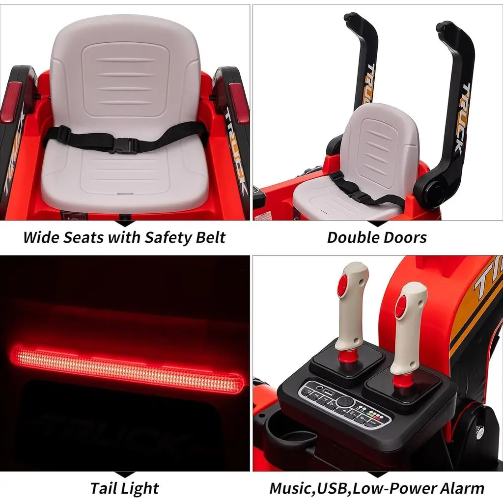 Fully Functional Electric Digging Arm:This excavator is equipped with a fully electric arm powered by two 35W motors, replicating the operation of a real excavator. Its realistic design enhances children's dexterity and coordination, providing an educational and entertaining experience. Extended Playtime and Speed:Featuring a robust 12V 10AH battery and four 75W motors, this electric digger offers up to 60 minutes of continuous play. With multiple speed settings available in both manual and remote control modes, it can reach a maximum speed of 3.1 MPH, perfect for young explorers. Versatile Terrain Capabilities:Designed for various surfaces, this kids' ride-on excavator excels on sand, grass, and flat ground. Its four 75W motors allow for impressive maneuverability, including a complete 360° rotation in place, providing endless play possibilities. Child Safety Features:Safety is a priority with this model, which includes a 2.4GHz remote control for emergency braking. Additional safety features such as smooth start and stop functions, a power display, and a safety belt create a secure play environment for children. Interactive and Engaging Entertainment:Equipped with Bluetooth and USB connectivity, this excavator can play music from various devices and features built-in modes for music and storytelling. These interactive elements keep children entertained and engaged during playtime, making it an ideal gift for kids aged 3-8 years with a maximum load capacity of 70 pounds.