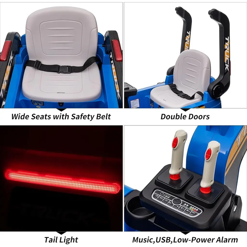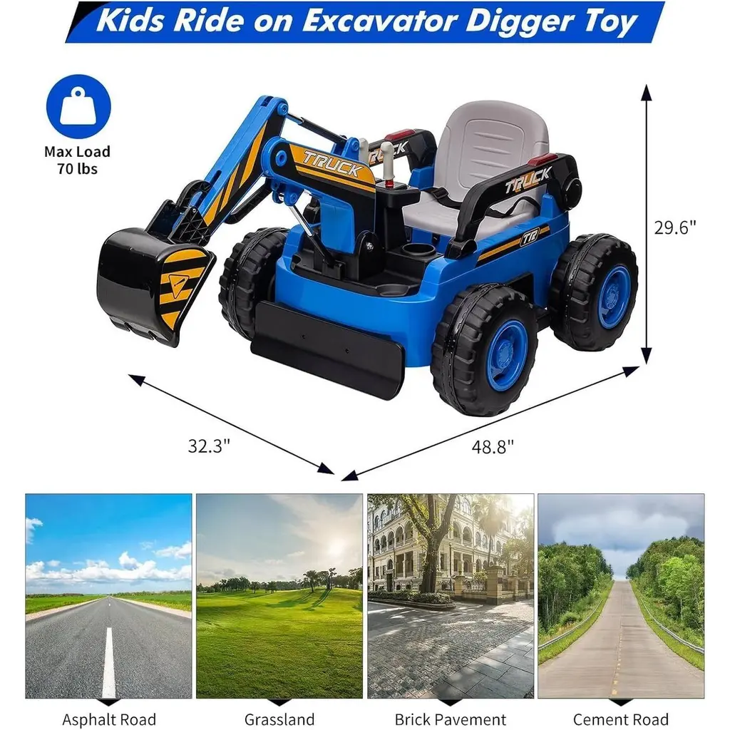 Fully Functional Electric Digging Arm:This excavator is equipped with a fully electric arm powered by two 35W motors, replicating the operation of a real excavator. Its realistic design enhances children's dexterity and coordination, providing an educational and entertaining experience. Extended Playtime and Speed:Featuring a robust 12V 10AH battery and four 75W motors, this electric digger offers up to 60 minutes of continuous play. With multiple speed settings available in both manual and remote control modes, it can reach a maximum speed of 3.1 MPH, perfect for young explorers. Versatile Terrain Capabilities:Designed for various surfaces, this kids' ride-on excavator excels on sand, grass, and flat ground. Its four 75W motors allow for impressive maneuverability, including a complete 360° rotation in place, providing endless play possibilities. Child Safety Features:Safety is a priority with this model, which includes a 2.4GHz remote control for emergency braking. Additional safety features such as smooth start and stop functions, a power display, and a safety belt create a secure play environment for children. Interactive and Engaging Entertainment:Equipped with Bluetooth and USB connectivity, this excavator can play music from various devices and features built-in modes for music and storytelling. These interactive elements keep children entertained and engaged during playtime, making it an ideal gift for kids aged 3-8 years with a maximum load capacity of 70 pounds.