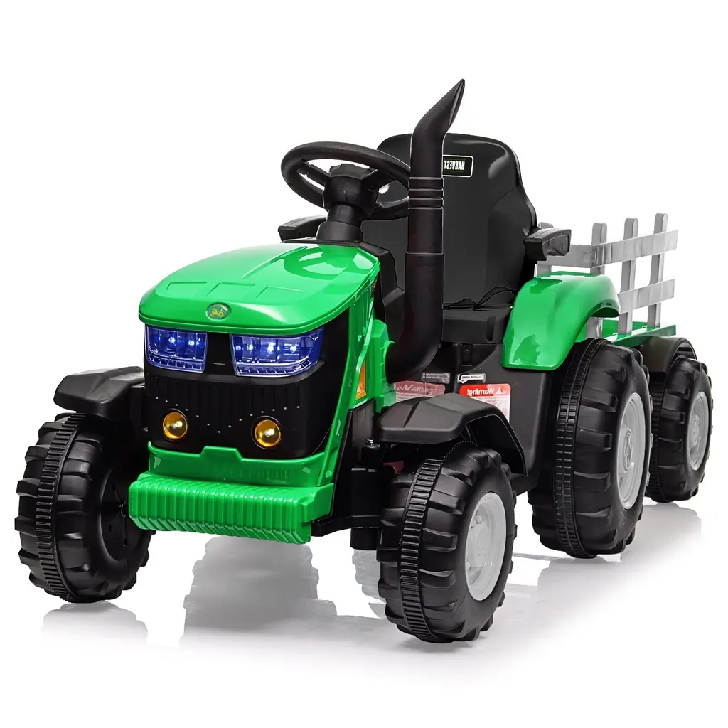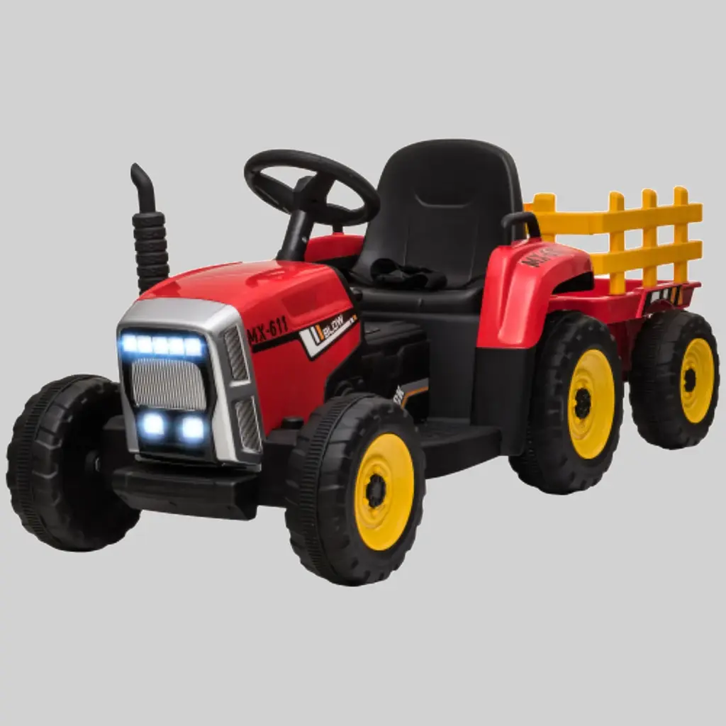 Detachable Trailer: This ride-on tractor features a detachable trailer that provides practical storage for small toys and snacks. Kids can enjoy imaginative play by driving in the backyard or garden while transporting tools and garden supplies, enhancing their outdoor adventures. Outstanding Performance: Equipped with a premium rechargeable battery and two powerful 35W motors, this toy tractor delivers impressive speed and performance on various terrains, including grass, dirt, and gravel. It can support a maximum load of 66 lbs, allowing children to enjoy extended playtime. Premium Materials & Durability: Made from high-quality PP and iron, this ride-on tractor is built to last with sturdy construction and a long service life. The combination of durable materials and a large-capacity rechargeable battery ensures that children can enjoy many miles of riding fun. 3-Gear System: The ride-on tractor offers a hands-on driving experience for little ones. After pressing the start button, children can independently drive the toy car forward using two different gears and reverse it with a low-speed gear, promoting motor skills and coordination. Built-in Fun Features: This ride-on tractor includes fun interactive elements, such as air-pressure powered horns that produce cool sounds. Additionally, it features Bluetooth wireless technology and an MP3 system, allowing kids to listen to their favorite music or stories while riding. The rechargeable battery takes 8-12 hours to charge for hours of entertainment.