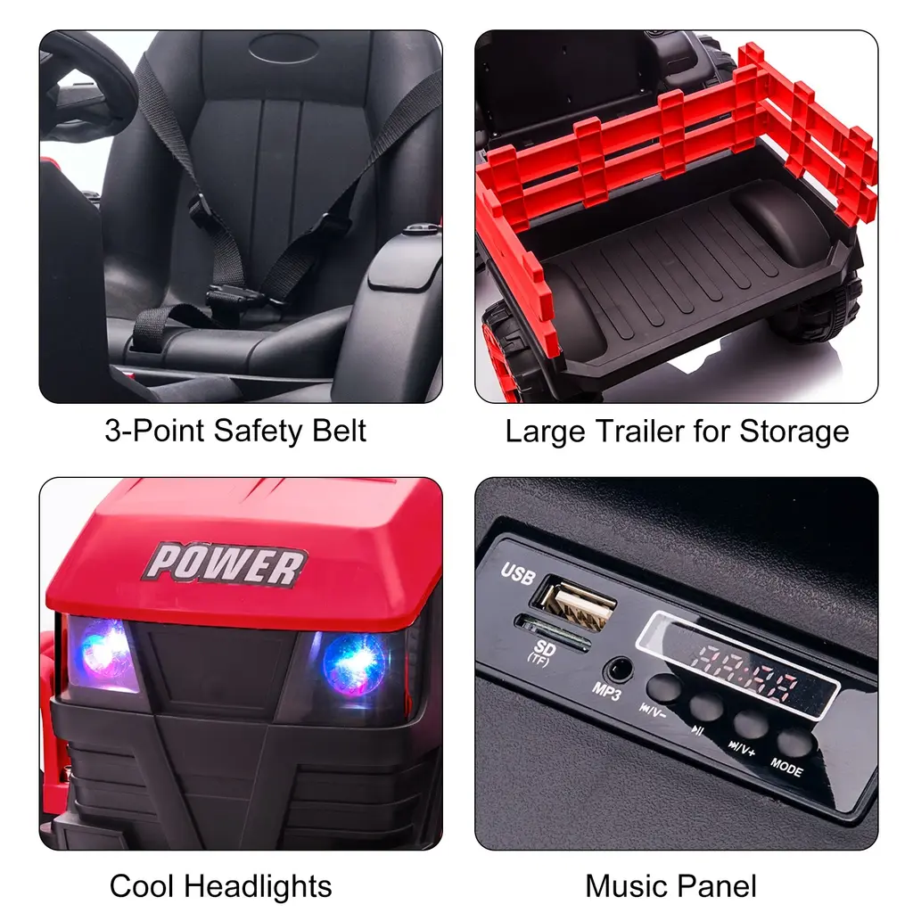 Parent Remote Control & Manual Mode: This ride-on tractor is designed with two driving modes, making it suitable for children aged 3 to 8 years. Parents can engage in quality bonding time by using the remote control mode for younger kids, while older children can experience the excitement of driving independently. Detachable Trailer for Extra Fun: The tractor comes with a detachable trailer that allows kids to transport toys, snacks, and other items while driving around the backyard, garden, or farm. This feature enhances imaginative play, as children can carry tools, garden supplies, or even pretend to haul grass, wood, and flowers. 12V Battery Powered with 6 Wheels: Powered by a 12V 7AH rechargeable battery and equipped with dual 35W motors, this electric tractor can reach speeds of 1.9 mph to 3.7 mph. It includes forward and reverse driving capabilities along with a 3-point safety belt, ensuring secure and safe play for kids during their adventures. Multi-Function Control Console: Designed for ease of use, the tractor features a one-key start system and a control console loaded with entertainment options. Kids can enjoy music and sound effects, as well as LED headlights, high/low speed settings, and MP3/USB/TF card connectivity for a realistic driving experience. Safe & Smooth Driving Experience: Constructed from high-quality, safe PP and metal materials, the tractor features durable wheels that provide smooth driving on various surfaces, including grass, dirt, gravel, and pavement. With a maximum weight capacity of 66 lbs, it is ideal for both indoor and outdoor play, and it meets ASTM and CPSIA safety certifications, assuring parents of its reliability.