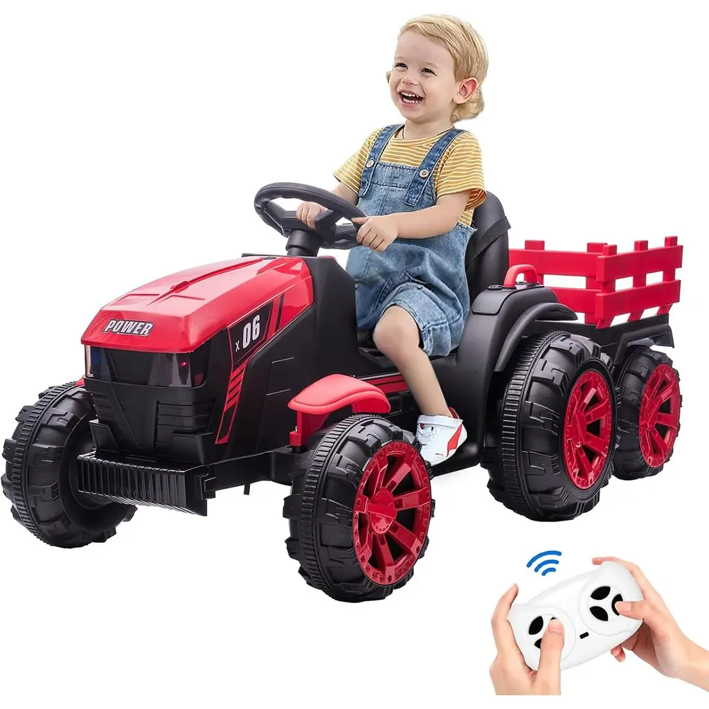 Manual & Parental Control: Provide more detailed instructions and guidance on how to use the parental control feature, including how to effectively use it to ensure the safety of the child. Additionally, consider adding a training mode for younger children to practice driving with parental control before being allowed to operate the vehicle independently. Safety Guarantee: Adding additional safety features such as a roll bar, reinforced frame, or padded seat to further protect the child from potential harm. Provide clear instructions on how to use all safety features, and ensure that the parent or caregiver is aware of how to properly use the remote control. Upgrade Version: Adding more options for customization, such as different tire types or colors. Additionally, offer replacement parts or repair services to ensure the longevity of the ride-on tractor. Build-in Fun: Offer a wider selection of music and sounds to choose from, or consider adding interactive features such as a map or game to engage the child while driving. Provide instructions on how to use all features, and ensure that they are easy to access and use. Realistic Tractor Design: This ride-on tractor features bright 7-LED headlights, a control pedal, a realistic 2+1 gear shift, a solid armrest, and a detachable trailer. It is powered by a rechargeable battery with 2*12V motors, and has an overall size of 54"(L) x 20"(W) x 21"(H) with a weight capacity of 66 lbs. The battery takes 8-12 hours to recharge. Specification: Material: PP+ Iron Dimension: 54 x 20x 21" Max capacity: 66 lbs Suitable Age: 3+ years Charge Time: 8-12 hours Speed: 1.9-5 mph