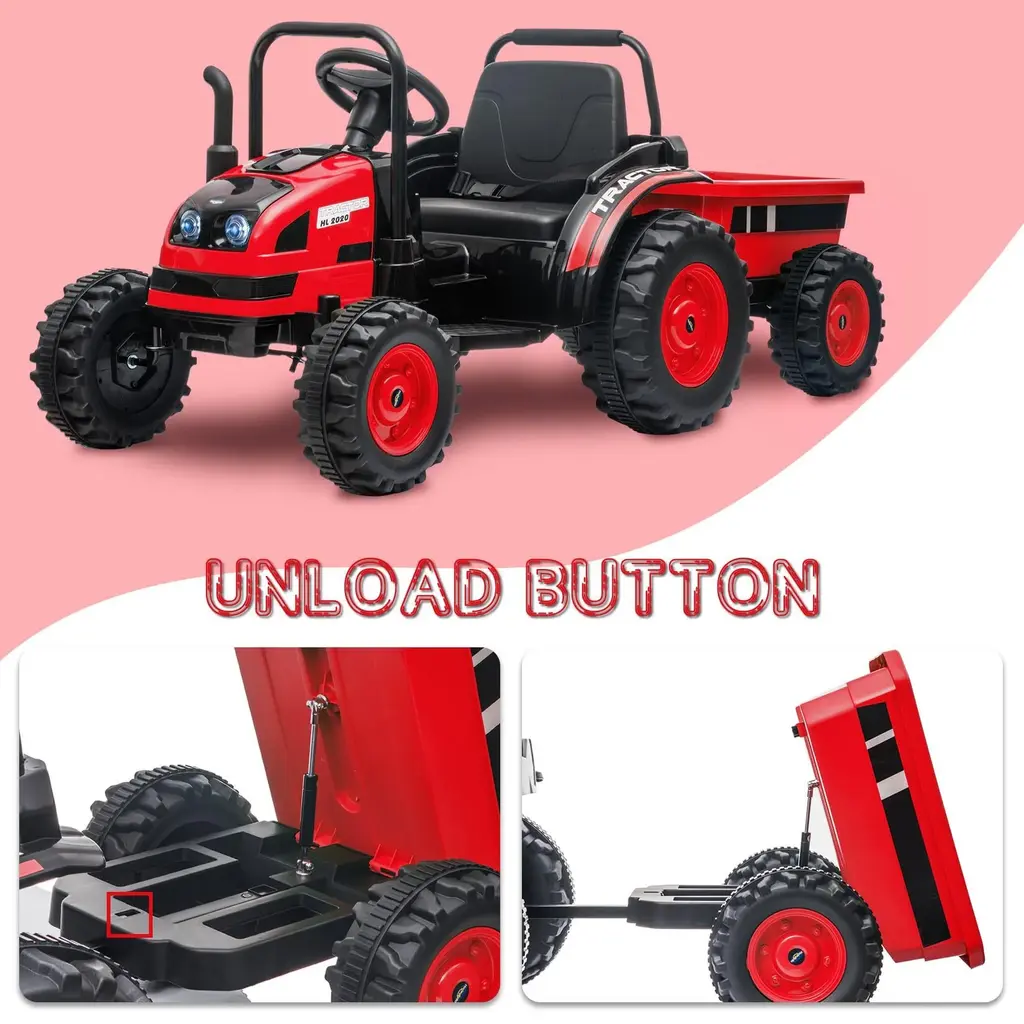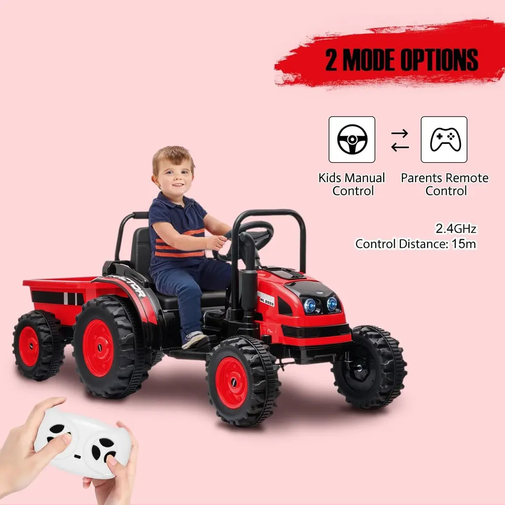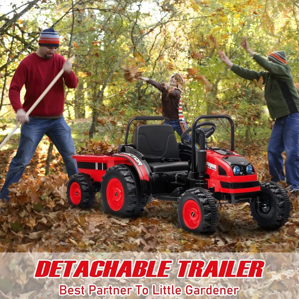 OUTSTANDING PERFORMANCE: Using a 12V 7Ah high-quality and stable battery, the ride on tractor runs for about 50 mins after a full charge. Charging time: 8-12 hours. With two 35W motors, the speed can reach 2-5mph. Wear-resistant and non-slip wheels are suitable for various terrains indoors and outdoors. Maximum load is 55LBS. DETACHABLE TRAILER: Kids' ride on tractor is designed with a large trailer. The little gardener will be very happy to transport toys, snacks, flowers, water, garden tools, etc. DON'T transport people. Take it down if no need. It has a button to help unload cargo. MUSIC FUN: A built-in audio device can play the preset sounds. Or play music children like through the Blue tooth/USB in an adjustable volume. Added fun and functionality during the driving time. PERFECT GIFT FOR KIDS: Made with high-quality materials, this ride on toy is durable and long-lasting. Kids' electric vehicles simulate the real driving experience. It's the perfect gift for kids who love outdoor play and imaginative adventures. 2 CONTROL MODES: Kids can manually control the tractor with the steering wheel and the foot pedal inside. Parents can control the vehicle by remote control, which promotes parent-child interaction. The remote control distance is about 15m.