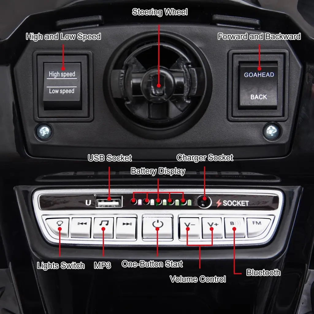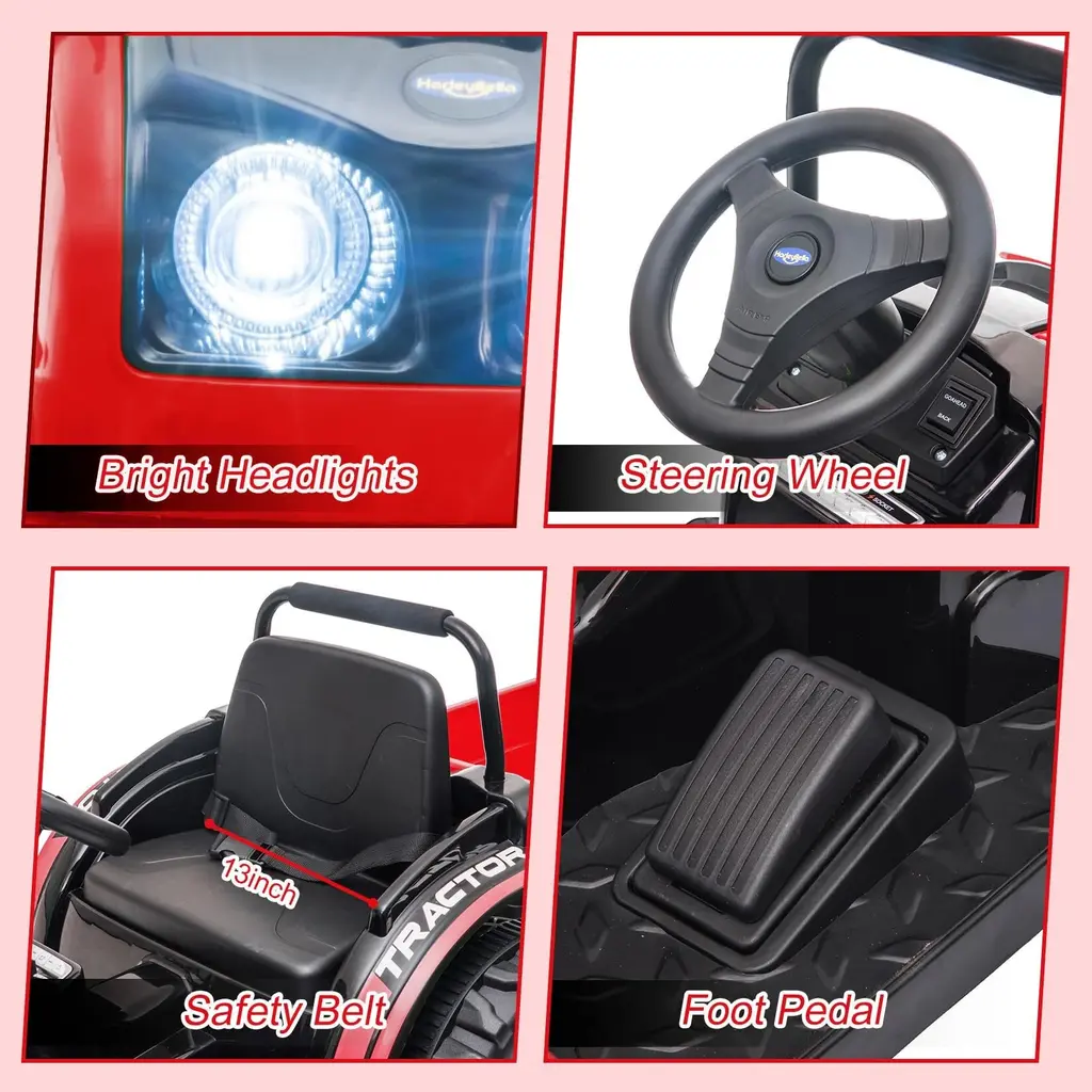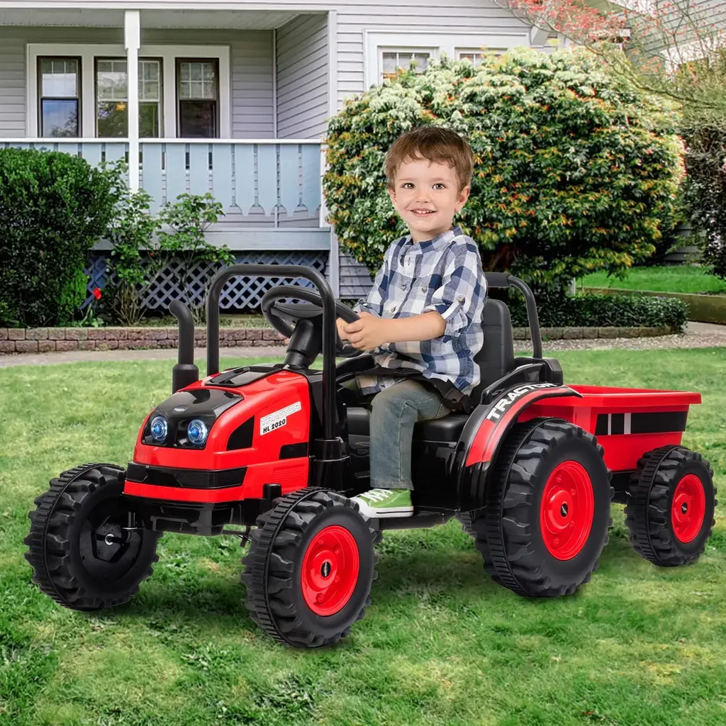 OUTSTANDING PERFORMANCE: Using a 12V 7Ah high-quality and stable battery, the ride on tractor runs for about 50 mins after a full charge. Charging time: 8-12 hours. With two 35W motors, the speed can reach 2-5mph. Wear-resistant and non-slip wheels are suitable for various terrains indoors and outdoors. Maximum load is 55LBS. DETACHABLE TRAILER: Kids' ride on tractor is designed with a large trailer. The little gardener will be very happy to transport toys, snacks, flowers, water, garden tools, etc. DON'T transport people. Take it down if no need. It has a button to help unload cargo. MUSIC FUN: A built-in audio device can play the preset sounds. Or play music children like through the Blue tooth/USB in an adjustable volume. Added fun and functionality during the driving time. PERFECT GIFT FOR KIDS: Made with high-quality materials, this ride on toy is durable and long-lasting. Kids' electric vehicles simulate the real driving experience. It's the perfect gift for kids who love outdoor play and imaginative adventures. 2 CONTROL MODES: Kids can manually control the tractor with the steering wheel and the foot pedal inside. Parents can control the vehicle by remote control, which promotes parent-child interaction. The remote control distance is about 15m.