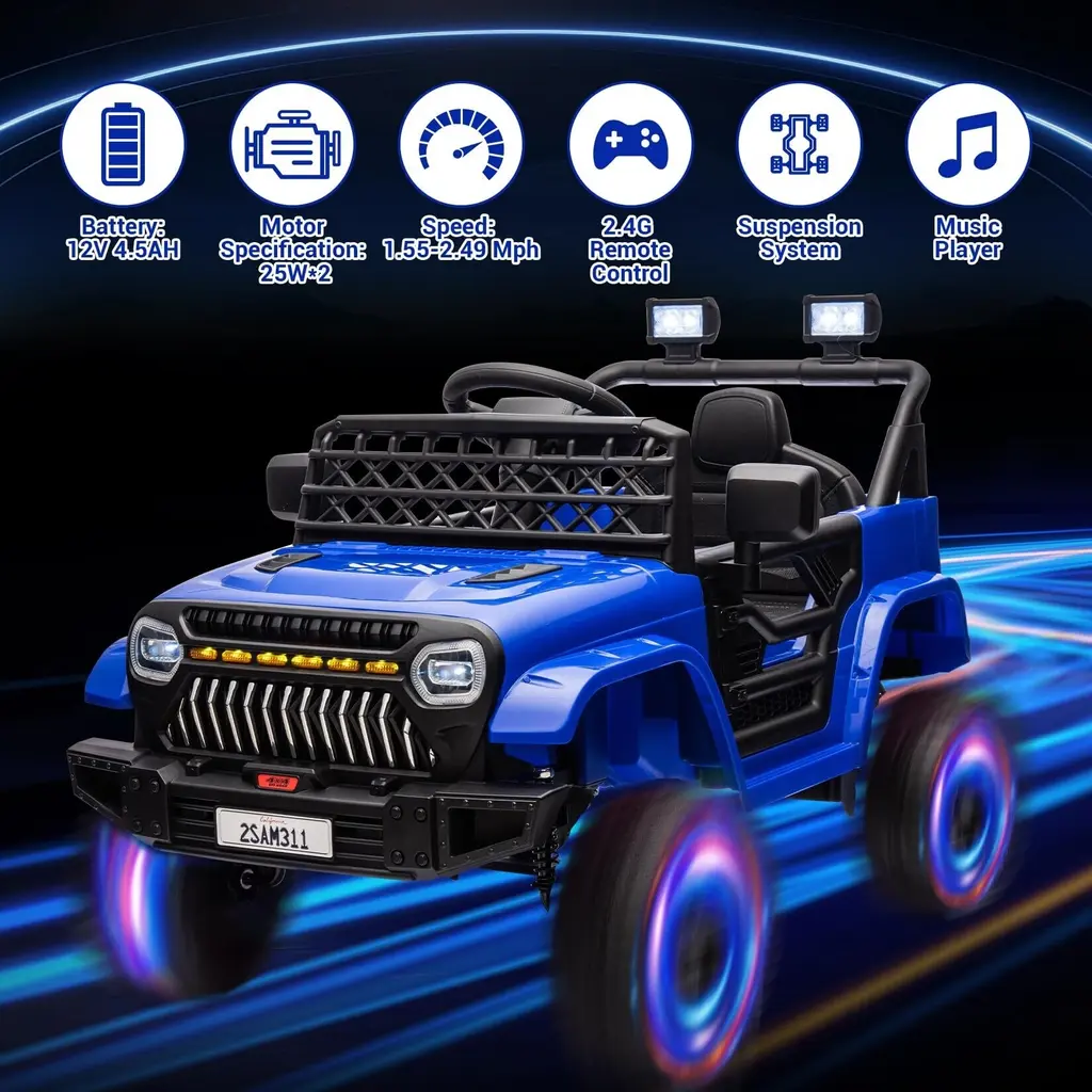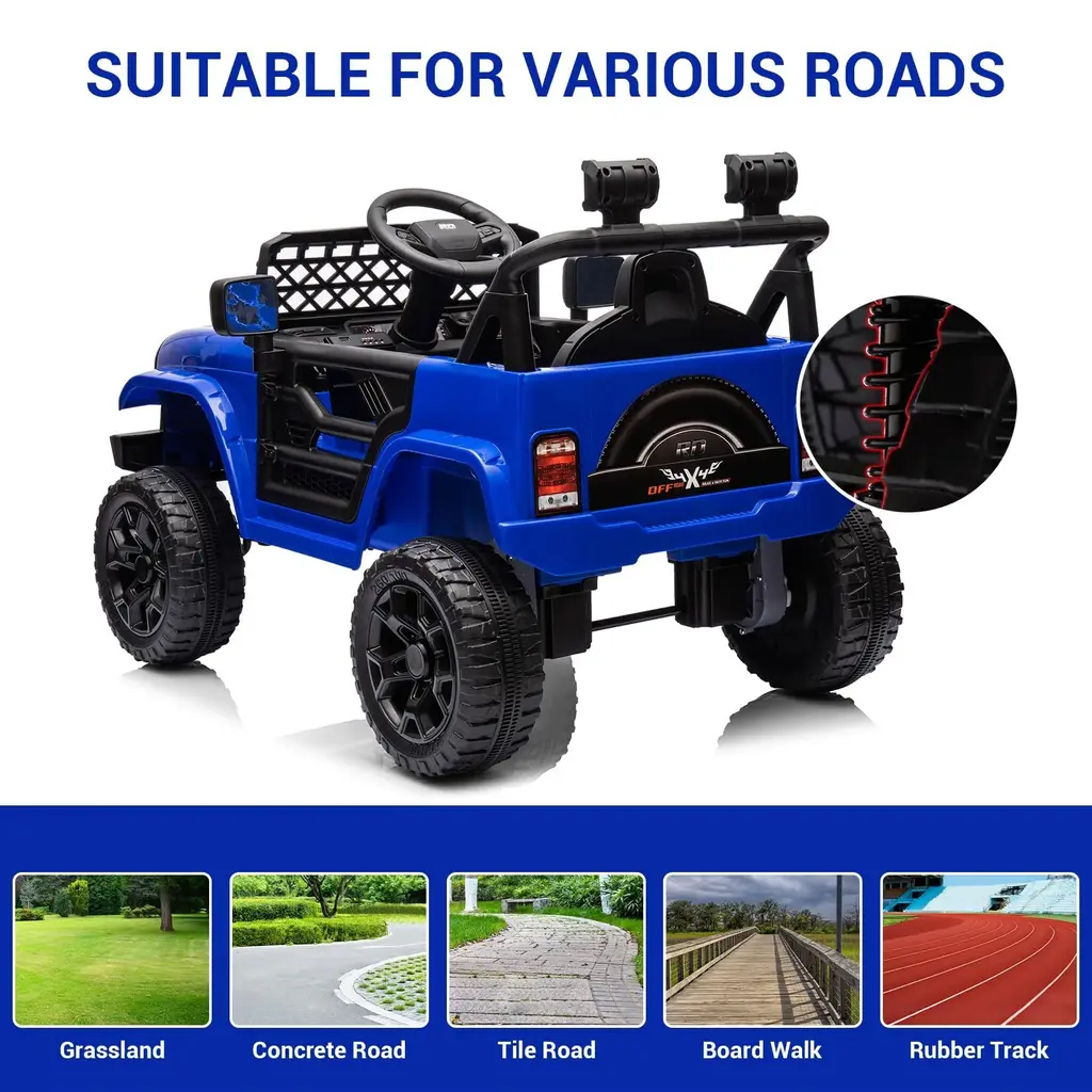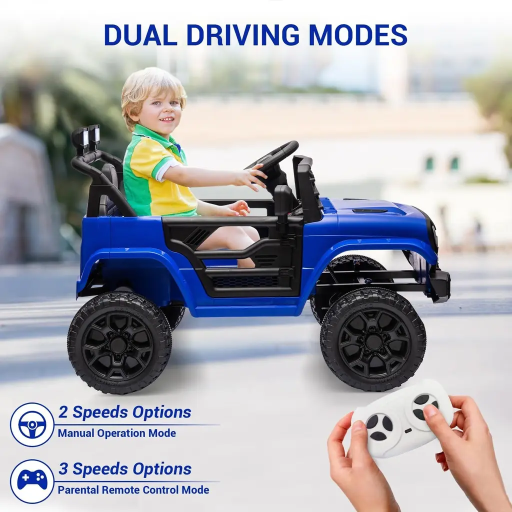 Dual Motors: This 12V ride-on truck ensures a thrilling driving experience of 1.55-2.49 Mph. 8-12 hours charging time provides 40-50 minutes of continuous fun, addressing the issue of limited battery life and allowing for extended entertainment. Smooth Ride Experience: Designed with slow start and spring shock absorbers, this 12V ride on truck protects your kids from the impact of rough terrain, ensuring a comfortable and stable ride for kids on bumpy roads. Two Driving Modes: This electric car offers a 3-speed driving experience with a steering wheel, electric foot pedal, and control panel. You can also supervise with a 2.4G remote featuring 2-speed settings, enhancing interaction with your kids. Fun & Functional: This kids ride on truck car features LED lights and MP3 music, allowing kids to play their favorite tunes, creating a multi-sensory play environment that is engaging and enjoyable for your kids. Ideal Gift For Your Kids: Ideal for kids aged 3+, this battery powered car for kids supports up to 66 lbs. Measuring 38.19" x 26.38" x 25.98", this toddler toy car provide a spacious space for kids to comfortably ride and enjoy the toy.