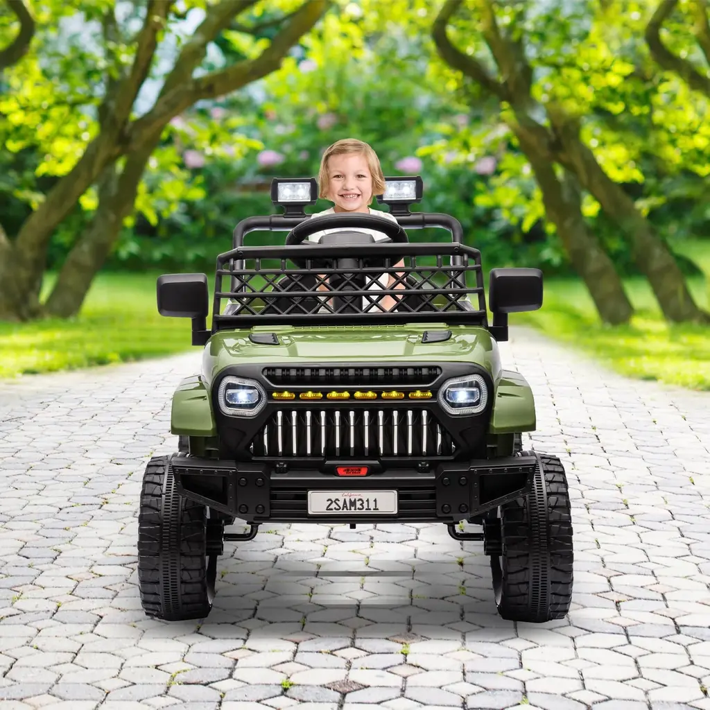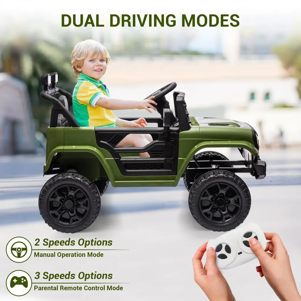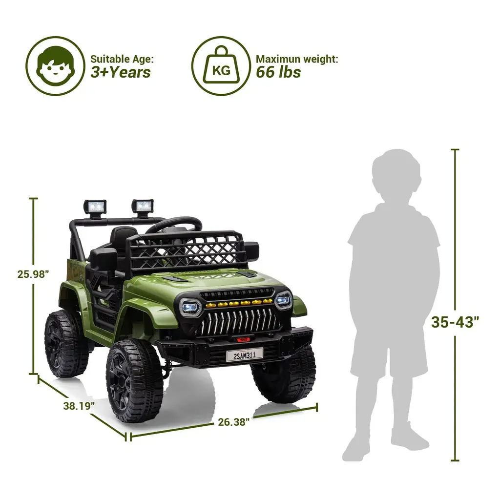 Dual Motors: This 12V ride-on truck ensures a thrilling driving experience of 1.55-2.49 Mph. 8-12 hours charging time provides 40-50 minutes of continuous fun, addressing the issue of limited battery life and allowing for extended entertainment. Smooth Ride Experience: Designed with slow start and spring shock absorbers, this 12V ride on truck protects your kids from the impact of rough terrain, ensuring a comfortable and stable ride for kids on bumpy roads. Two Driving Modes: This electric car offers a 3-speed driving experience with a steering wheel, electric foot pedal, and control panel. You can also supervise with a 2.4G remote featuring 2-speed settings, enhancing interaction with your kids. Fun & Functional: This kids ride on truck car features LED lights and MP3 music, allowing kids to play their favorite tunes, creating a multi-sensory play environment that is engaging and enjoyable for your kids. Ideal Gift For Your Kids: Ideal for kids aged 3+, this battery powered car for kids supports up to 66 lbs. Measuring 38.19" x 26.38" x 25.98", this toddler toy car provide a spacious space for kids to comfortably ride and enjoy the toy.