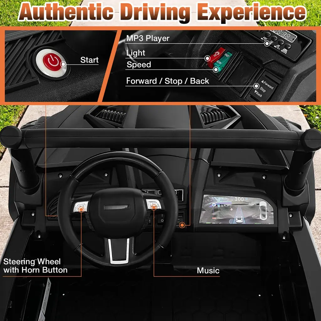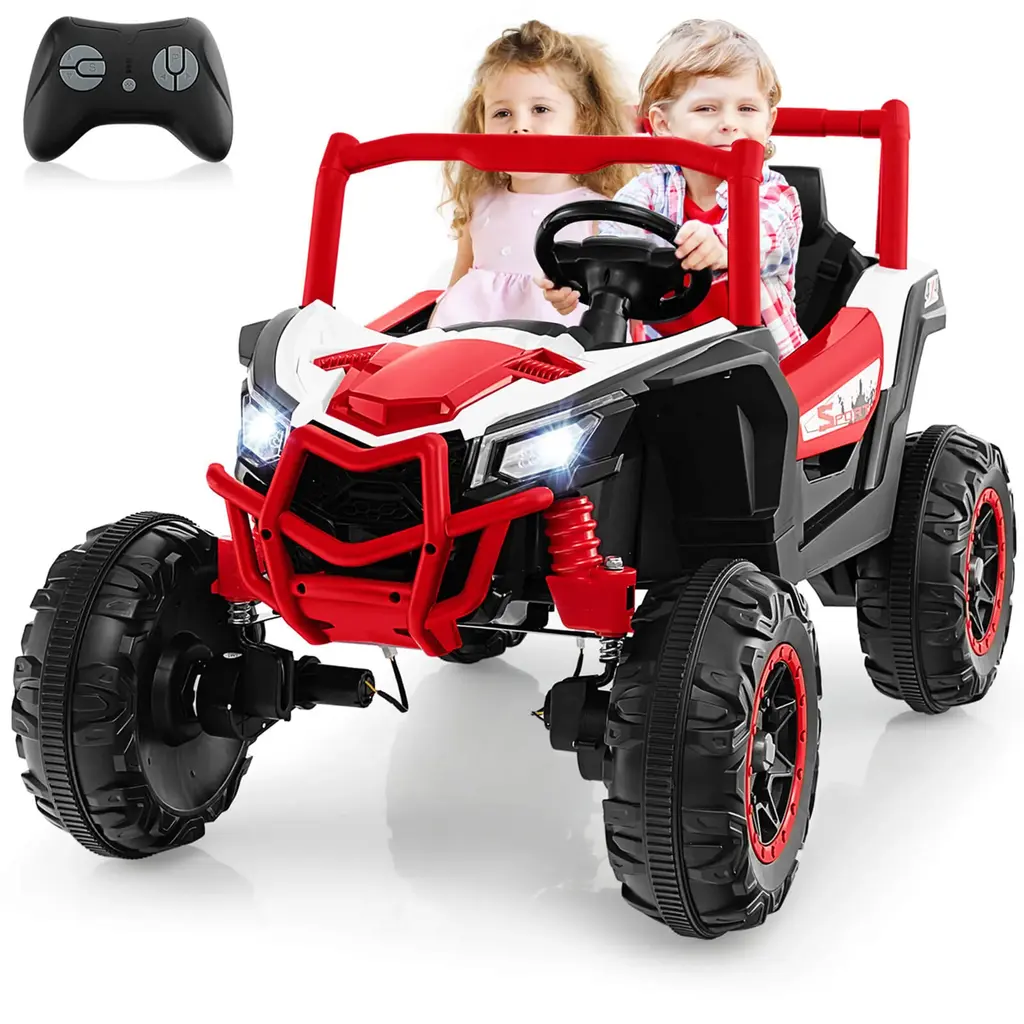 Are you looking for a two-seater car suitable for children over 3 years old? This car offers two driving modes, which are enhanced by the slow start function to ensure a smoother acceleration and protect your child from the impact of sudden movements. In addition, three-point seat belts and locked doors can ensure that your child is safely seated while driving. This 24V battery-powered UTV not only provides a real driving experience, but also is equipped with cool headlights and a music system to keep your children entertained. Take risks on any surface! Whether dealing with hard pavement or paved pavement, the flexible 4WD/2WD system can be adjusted according to the terrain requirements. Wear-resistant wheels are equipped with four suspension springs for a smoother driving experience. Get ready to enjoy hours of fun and adventure with this toy for children over 3 years old! Features:Specification