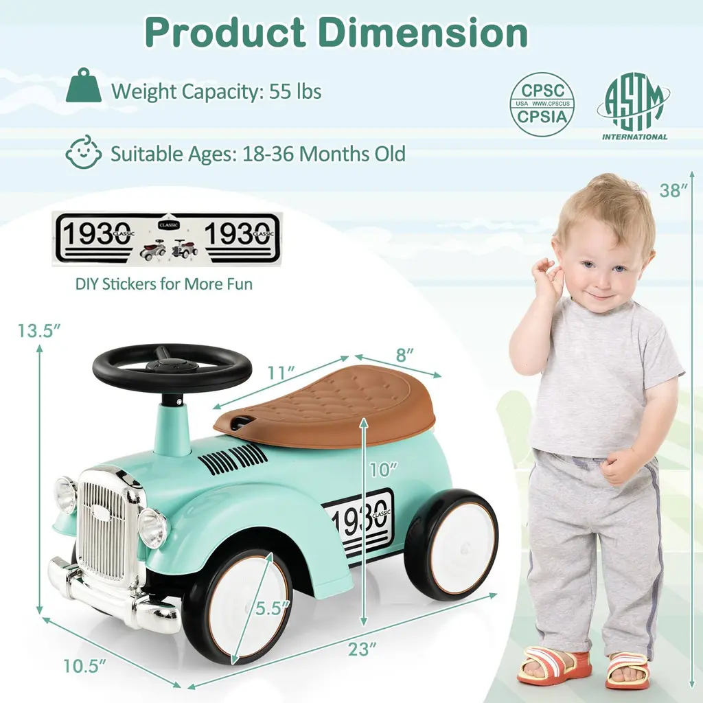 Specifications:Key Features:● Safe and Realistic Riding: This retro ride-on car features a realistic steering wheel with sound that enables kids to turn left or right easily. Moreover, the 40° safe limit steering avoids side falling by accident. Certified by ASTM and CPSIA, this toddler ride-on toy is more reliable.● Ergonomic Seat with Storage: With a large and curved seat, the foot to floor riding toy offers kids a cozy sitting experience. In addition, the under-seat storage space holds kids' belongings within reach. You can lock or unlock the seat with an easy-to-operate knob.● All-terrain EVA Wheels: The sit to stand vehicle has 4 large wheels, which are anti-slip, wear resistant and shock-absorbent. Thus, they can prevent damage to the floor and adapt to various types of road. And toddlers are able to enjoy indoor or outdoor fun.● Retro Style and Fun Stickers: Thanks to all-around rounded edges, this baby-ride-on toy effectively prevents injuries by accidental bumps. The cool appearance is attractive to little ones. What's more, the interesting stickers bring more fun of DIY.● Perfect Gift for Boys and Girls: This ride-on toy will help toddlers to exercise leg muscles, cultivate motor skills, develop balance, improve coordination, and gain self-confidence and more. So, it is a great gift for kids aged 18-36 months old.