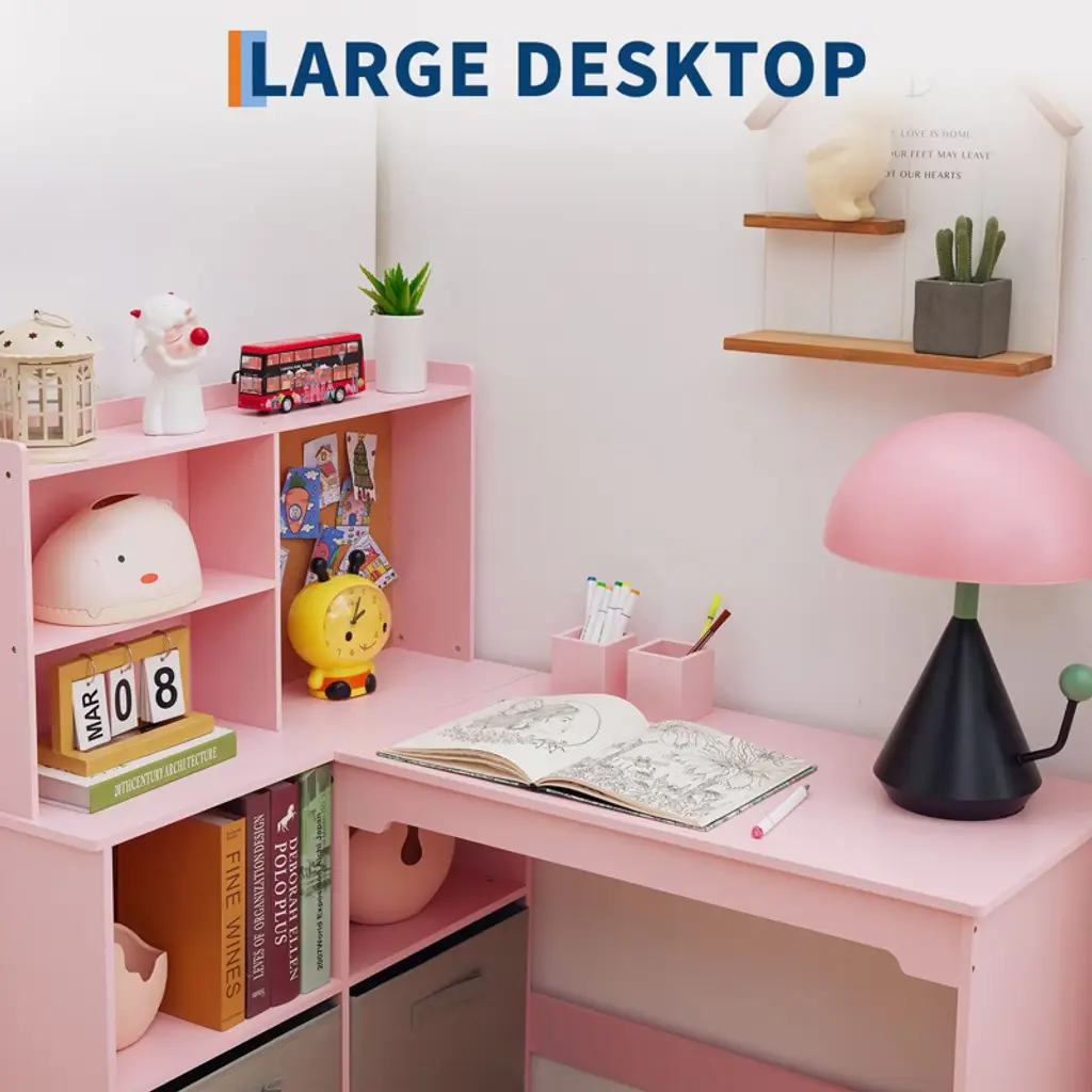 The desk set features ample storage options, including opened storage, a bookshelf and a cork board. Personal items like photo frames, alarm clocks, mini plants, dolls, and books can all be organized and stored neatly.It makes an excellent birthday or learning gift for young children. It helps them keep their personal belongings organized, and encourages a positive learning environment.