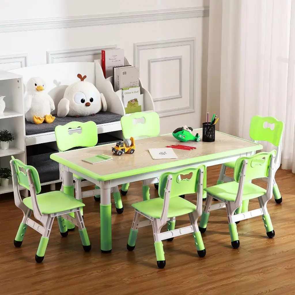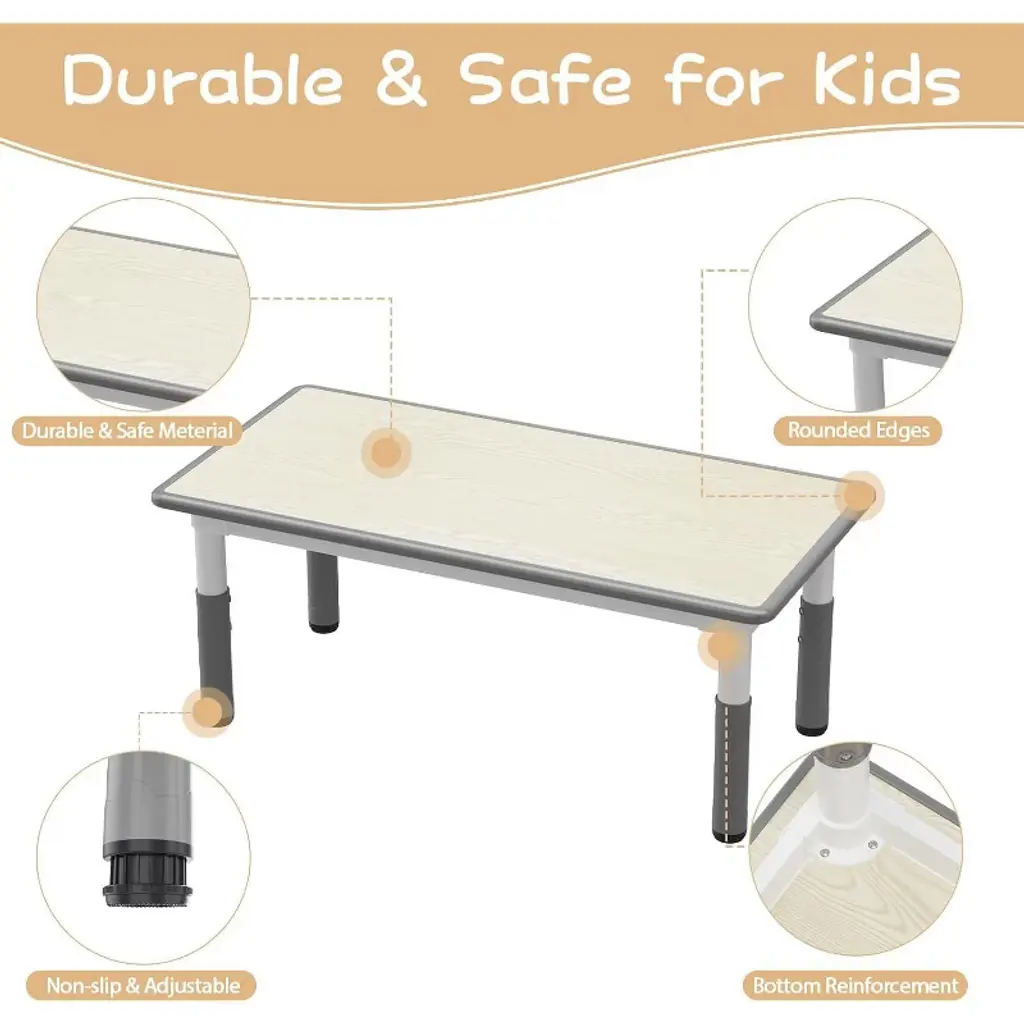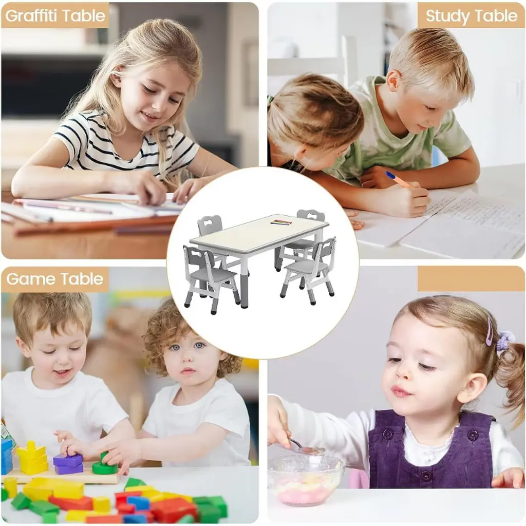 Introducing the Kids Table and 4 Chair Set, the perfect solution for your toddler's playtime, learning, and activities. This versatile set is designed with adjustable height features, allowing it to grow with your child and provide a comfortable seating arrangement for various ages. Crafted with safety and durability in mind, the set includes non-slip rubber mats on the chair legs to ensure stability and prevent slipping on any surface. Ideal for use at home, in classrooms, or playrooms, this toddler table and chair set encourages creativity, focus, and social interaction. The smooth, easy-to-clean surfaces make maintenance simple, while the sturdy construction guarantees long-lasting use. Whether your child is drawing, crafting, or enjoying snack time, this kid activity table set offers the perfect space for all their needs. Key Features: - Adjustable height table and chairs to accommodate growing toddlers - Non-slip rubber mats on chair legs for enhanced safety and stability - Durable and easy-to-clean surfaces ideal for various activities - Perfect for classroom, playroom, or home use - Lightweight yet sturdy design for easy movement and long-lasting use Enhance your child's learning and play environment with this thoughtfully designed toddler table and chair set. It’s not just furniture; it’s a space for discovery, creativity, and fun. Invest in quality, safety, and style with this kid table chair set today.