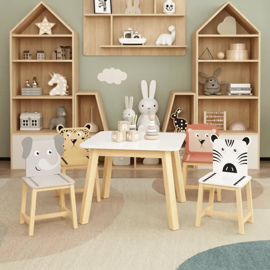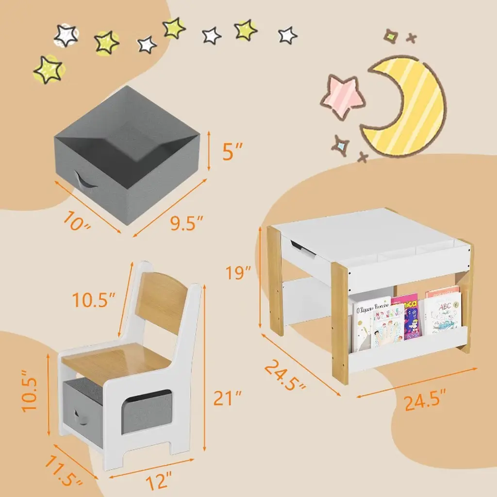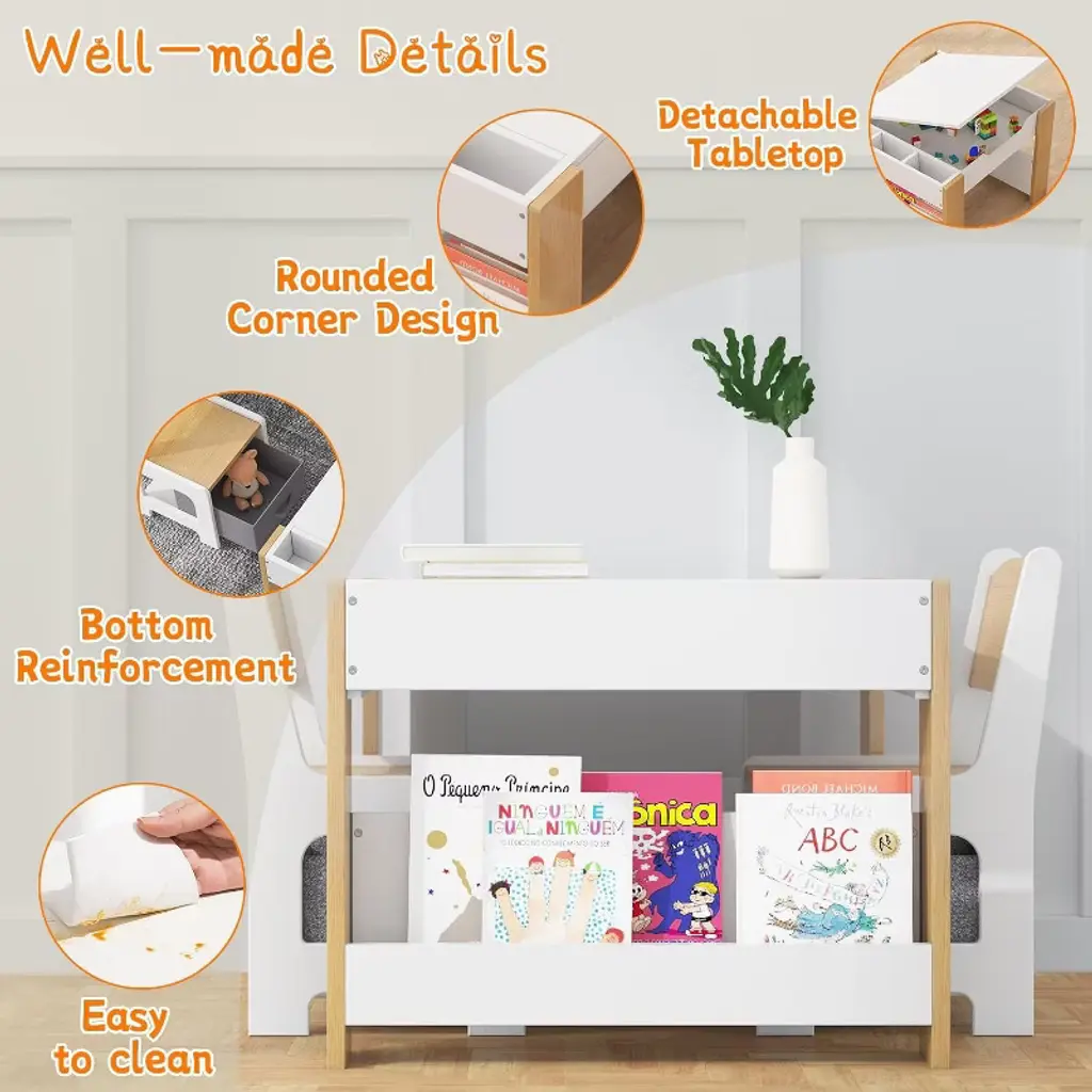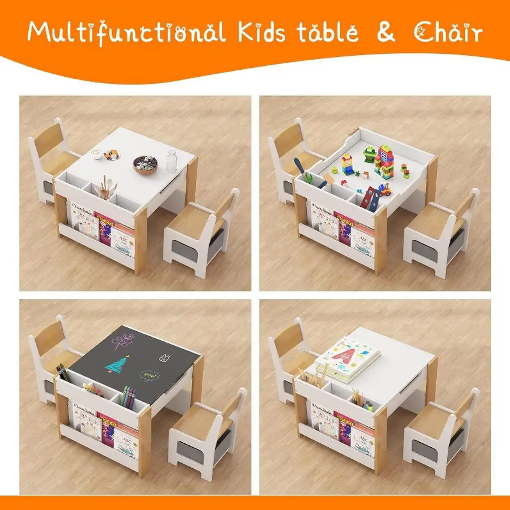 Versatile 4-in-1 Design: This kids table and chair set provides a versatile space for drawing, reading, crafts, art, and homework, perfect for toddlers and kids. Durable Wooden Construction: Made of high-quality wood, this sturdy activity table and chair set withstands everyday use while adding a charming touch to any nursery or playroom. Convenient Storage Drawer: Built-in storage drawers keep art supplies and homework materials organized and easily accessible, creating a tidy play area. Three small storage boxes can also be used to prevent stationery and other related items, simple and practical. Removable desktop: The innovative removable desktop can be easily converted between activities, ensuring your child enjoys endless fun and creativity. Fits Any Space: This table and chair set is sized for toddlers and fits seamlessly into any nursery, playroom, or learning environment, encouraging social interaction and imaginative play.